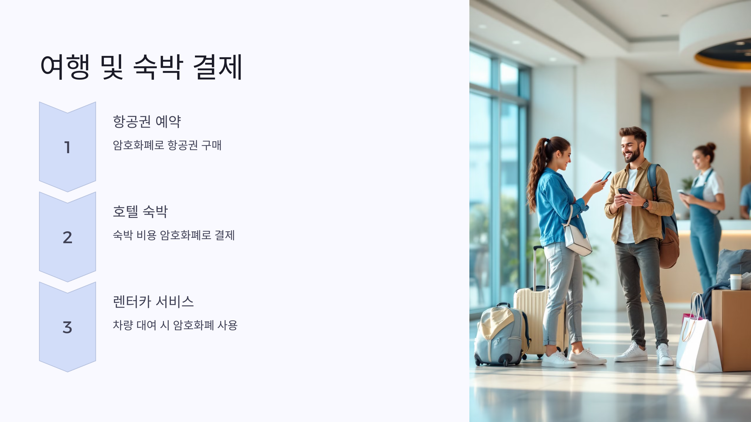 지불형 코인은 항공권 예약, 호텔 숙박 결제 등 여행 산업에서 활발히 사용되고 있습니다.