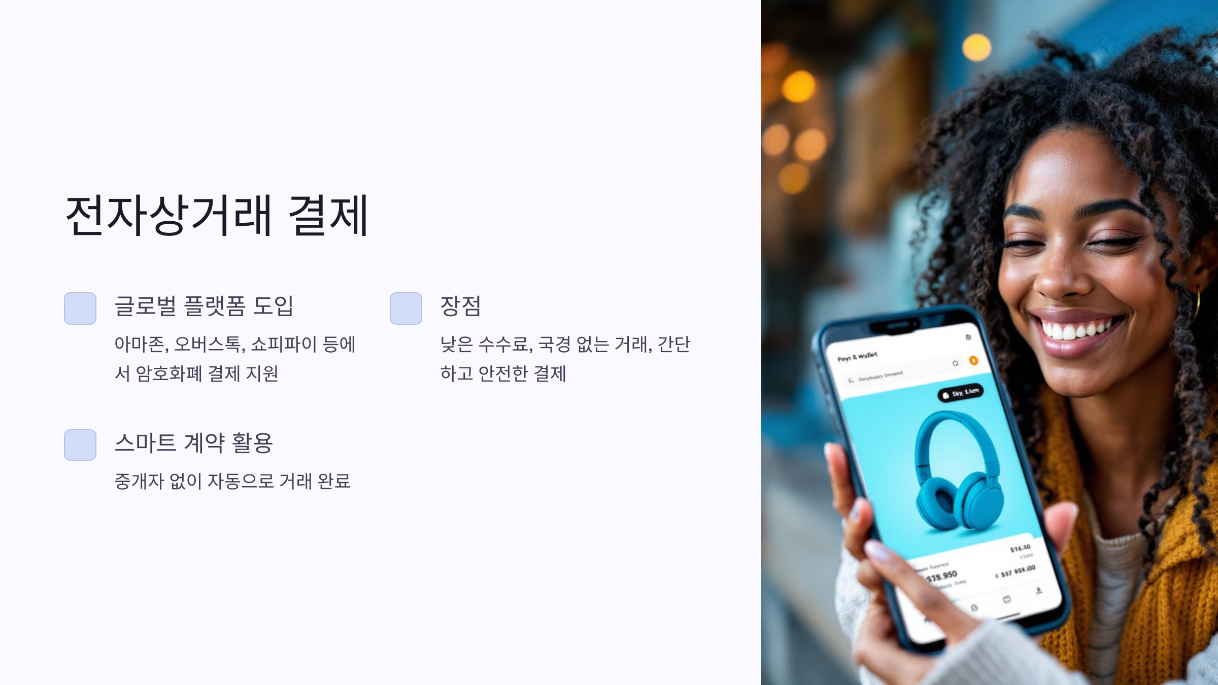 암호화폐 결제는 낮은 수수료와 국경 없는 거래를 지원하여 글로벌 전자상거래에서 활용됩니다.
