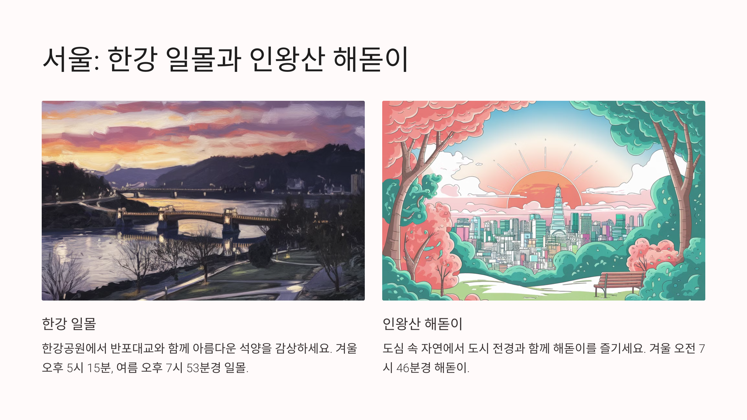 서울의 해돋이와 일몰은 도시적인 매력과 자연의 아름다움을 동시에 느낄 수 있는 특별한 경험입니다.