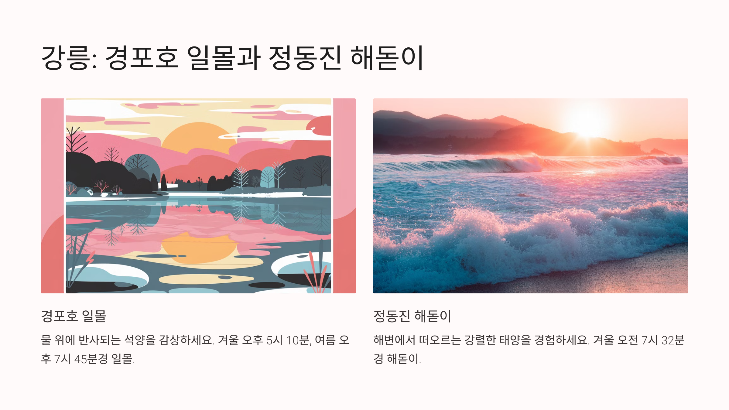 강릉의 자연은 일몰과 해돋이 모두에서 아름다움을 극대화시켜 잊지 못할 경험을 제공합니다.