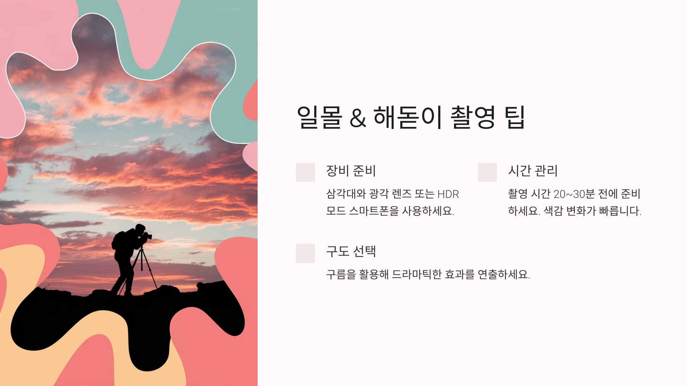 촬영 시간보다 20~30분 일찍 준비해 최적의 위치와 각도를 확보하세요. 해가 뜨거나 질 때의 색감은 매우 빠르게 변합니다.