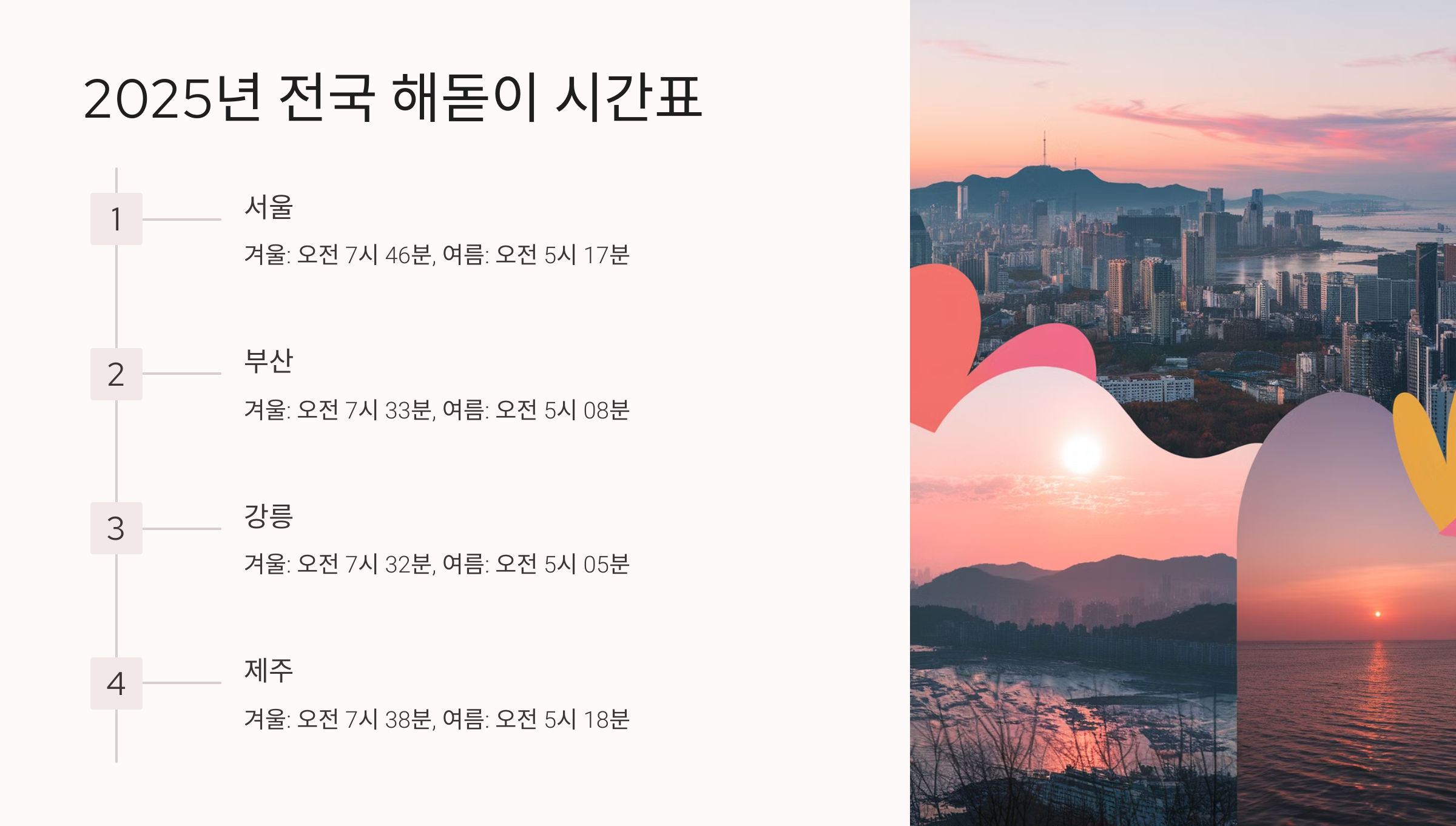 2025년 주요 도시별 해돋이 시간을 정리한 표입니다. 새해 첫날 해돋이를 계획하고 계신다면 아래 정보를 참고하세요.