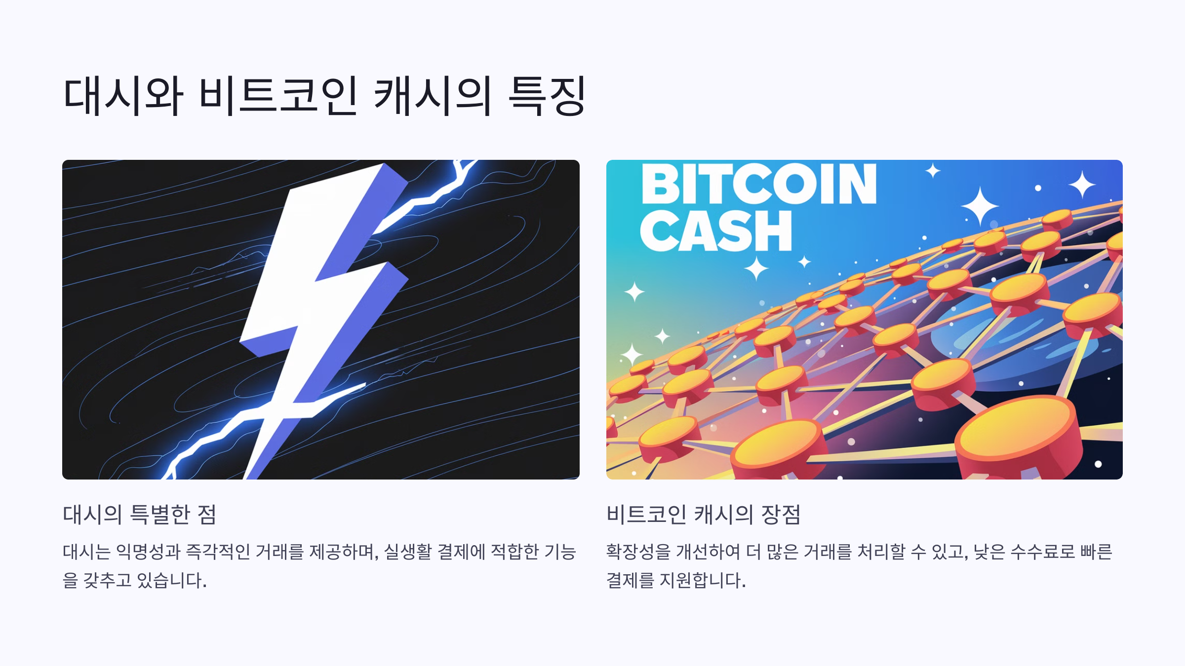 대시는 익명성과 즉각적인 거래를 제공하며, 실생활 결제에 적합한 기능을 갖추고 있습니다.