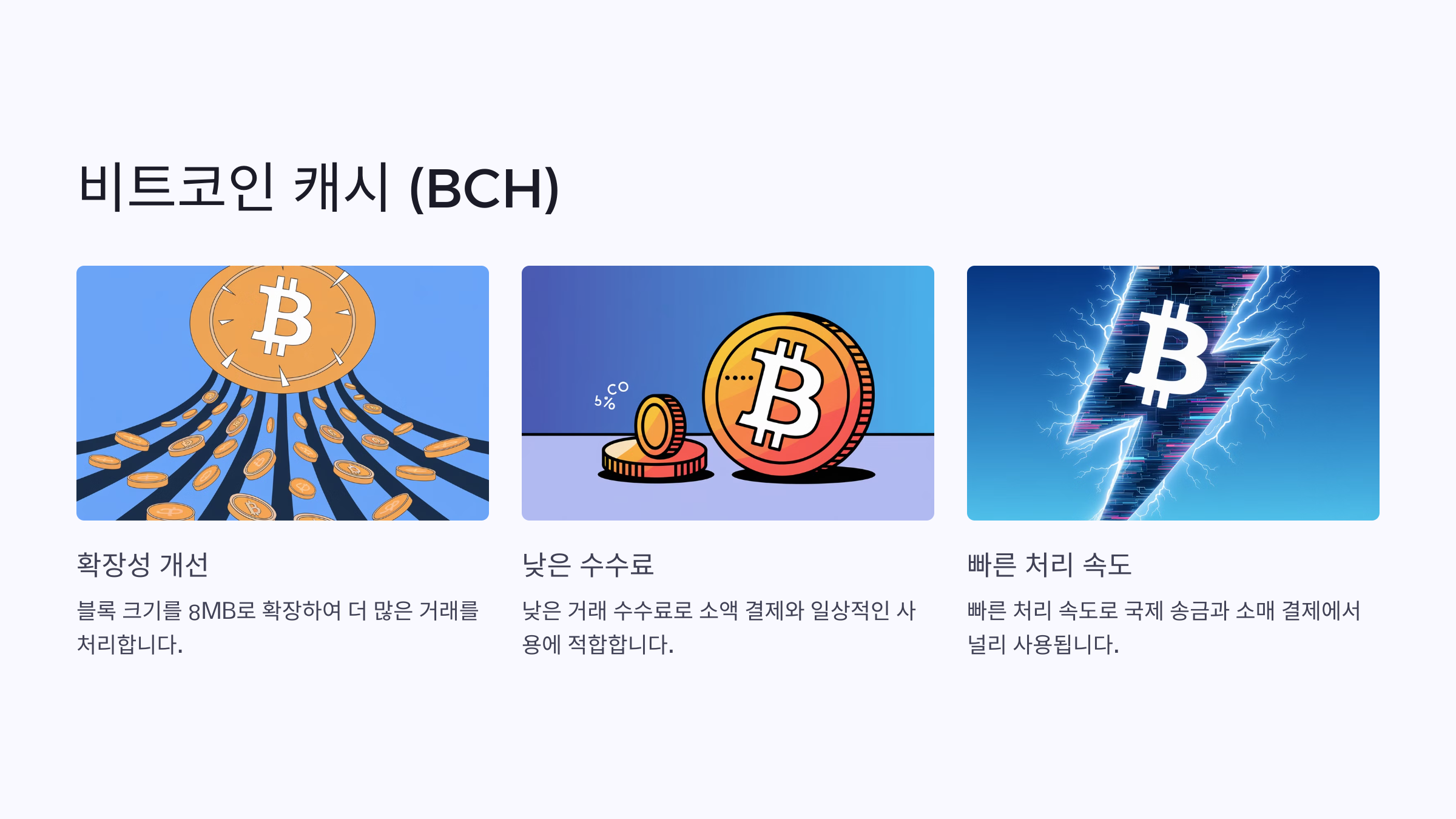 | 비트코인 캐시 (BCH) | 10분 | 2100만 개 | 확장성, 낮은 수수료 |