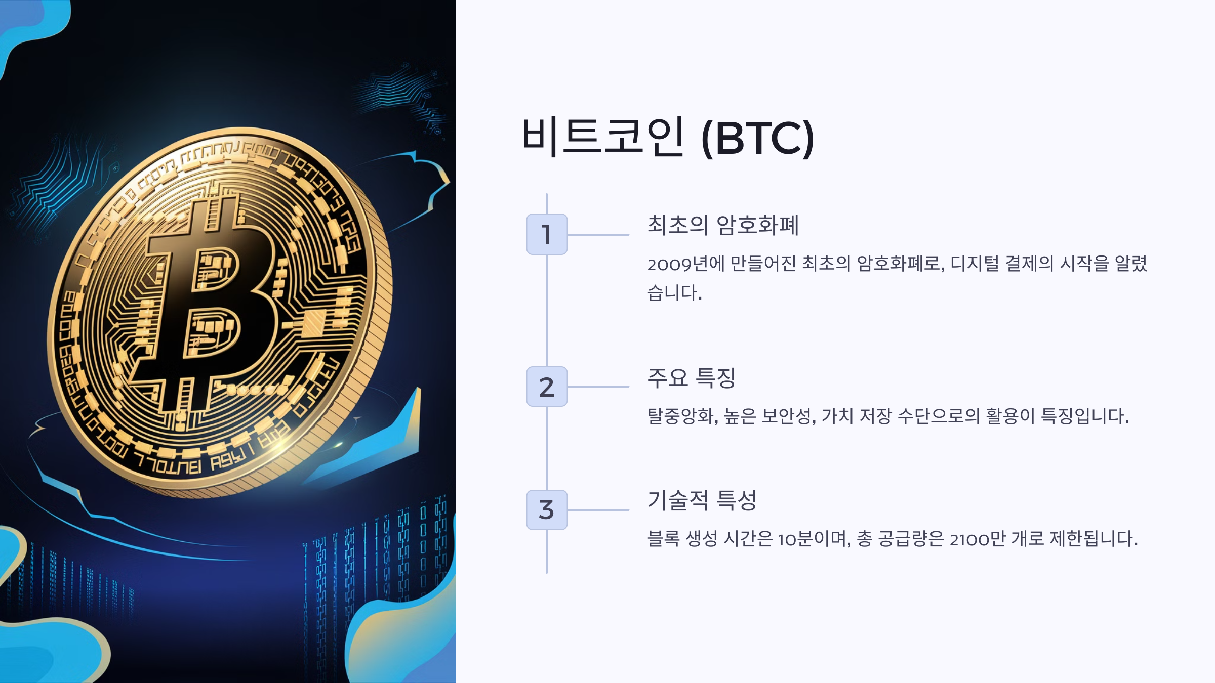 | 비트코인 (BTC) | 10분 | 2100만 개 | 가치 저장 수단, 높은 보안성 |