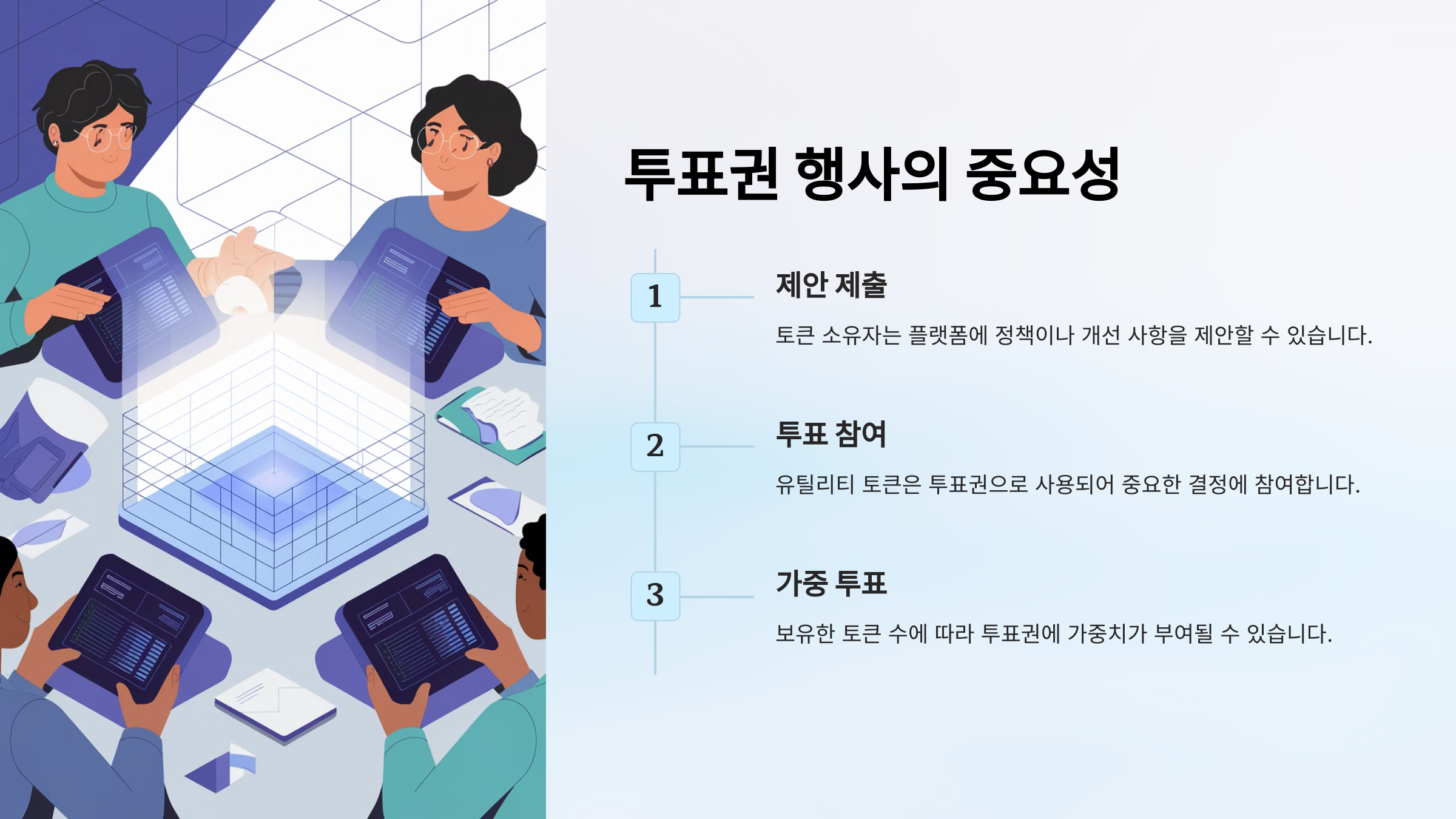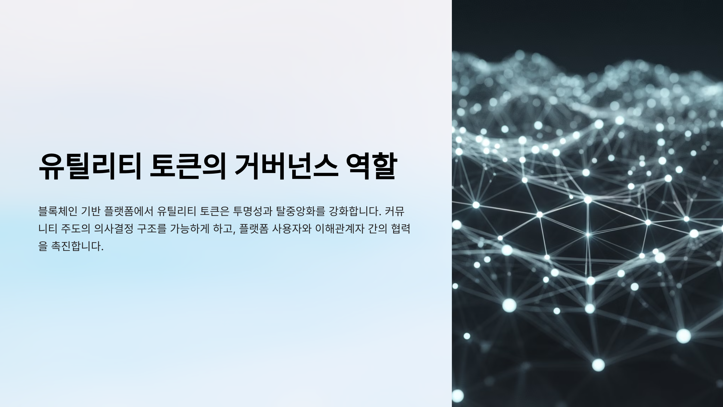 유틸리티 토큰은 탈중앙화된 의사결정 구조를 가능하게 하고, 플랫폼의 투명성을 높입니다.