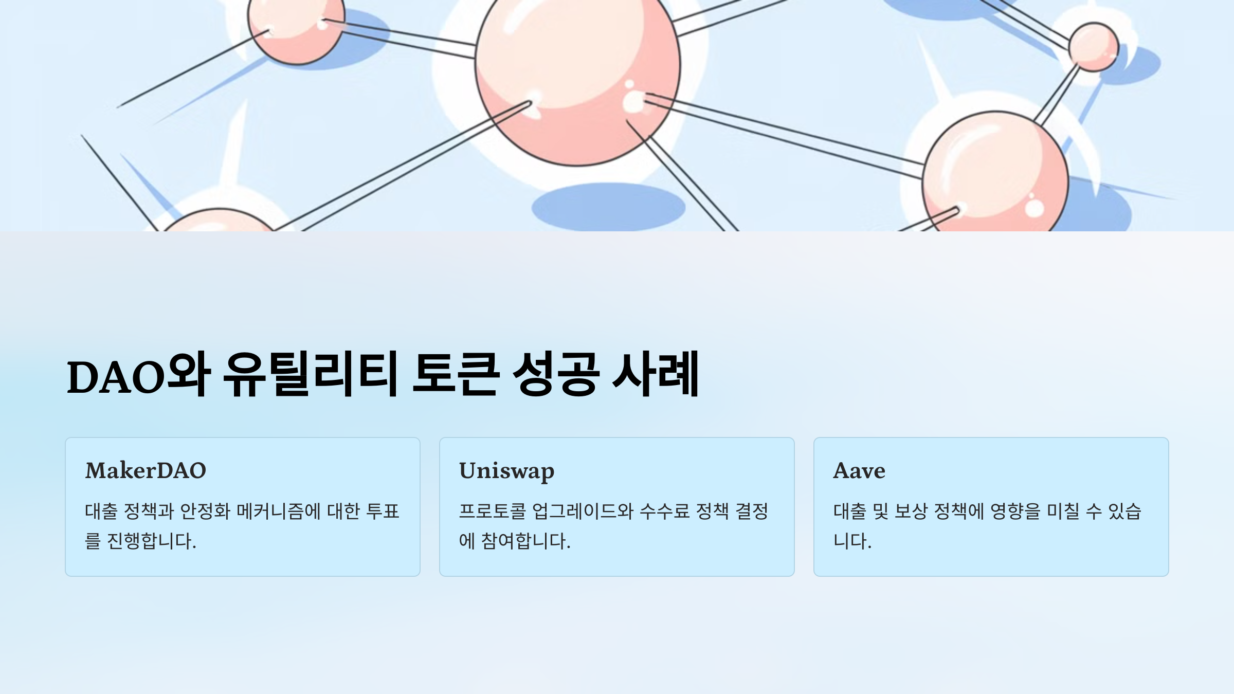 DAO(탈중앙화 자율 조직)는 유틸리티 토큰을 활용해 투명하고 민주적인 운영을 실현한 사례입니다.