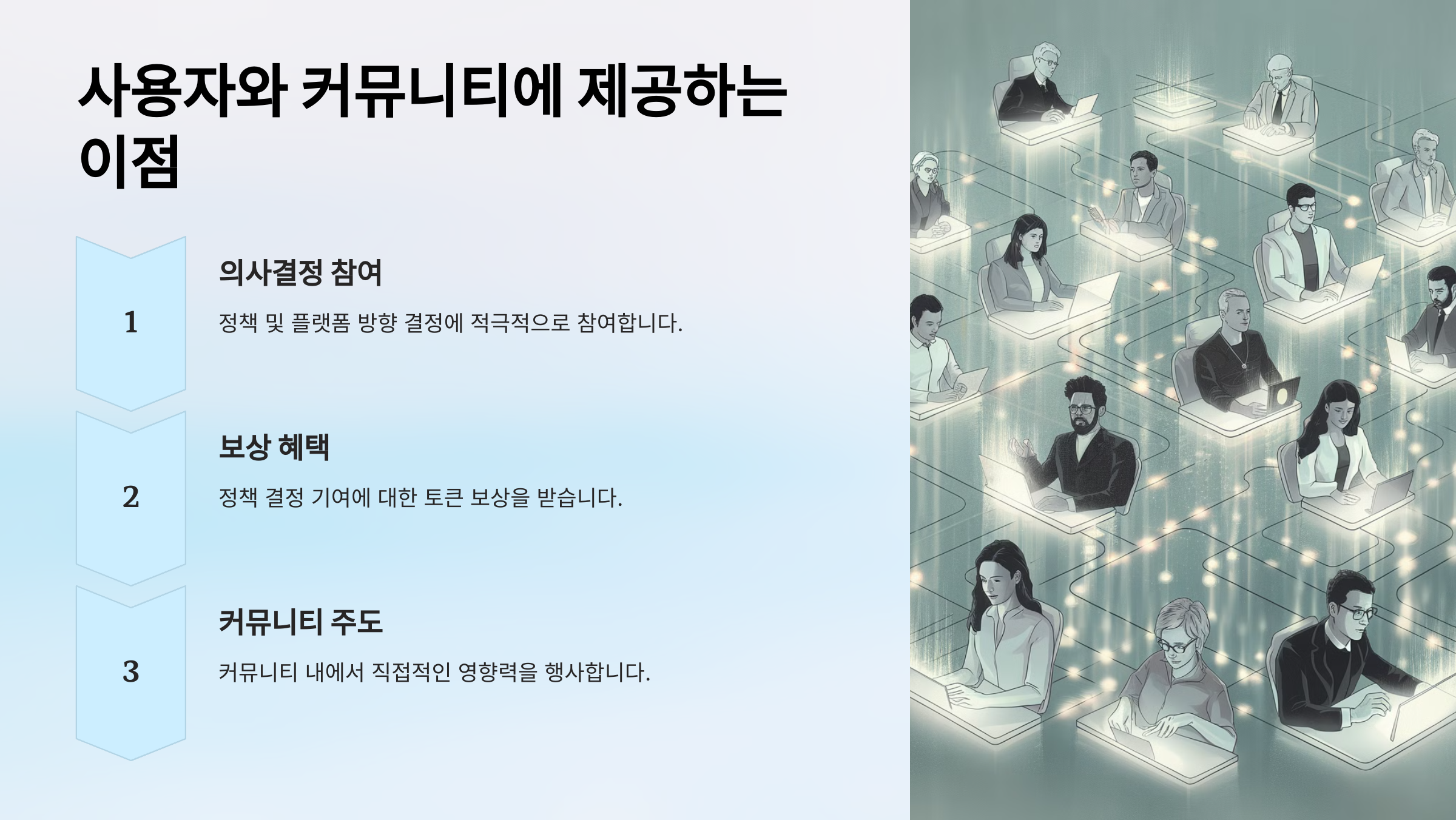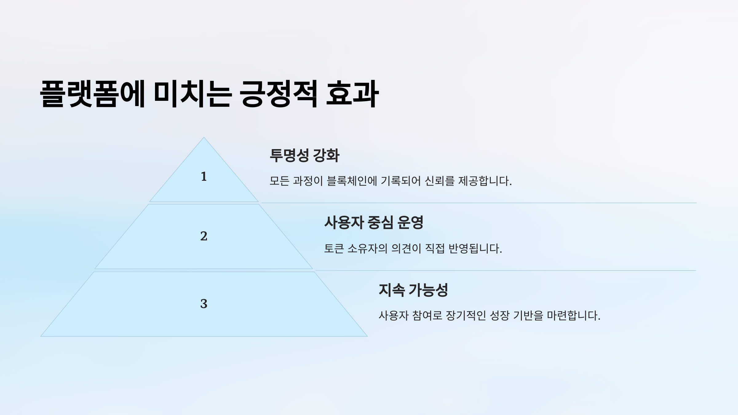 2. 사용자 중심 운영: 토큰 소유자의 의견이 플랫폼 운영에 직접 반영됩니다.