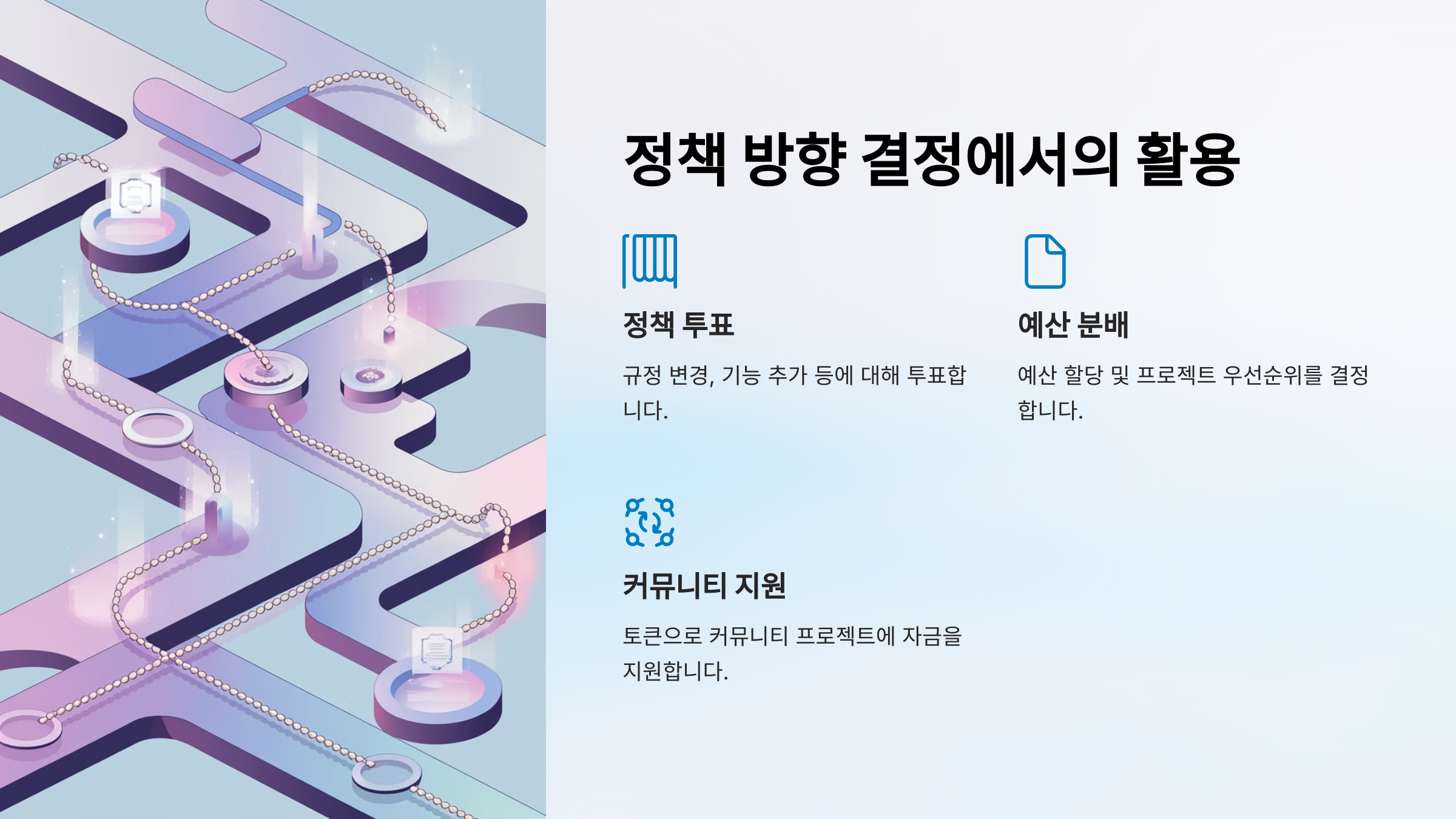 DAO는 유틸리티 토큰을 활용해 정책 결정과 커뮤니티 운영을 탈중앙화합니다.