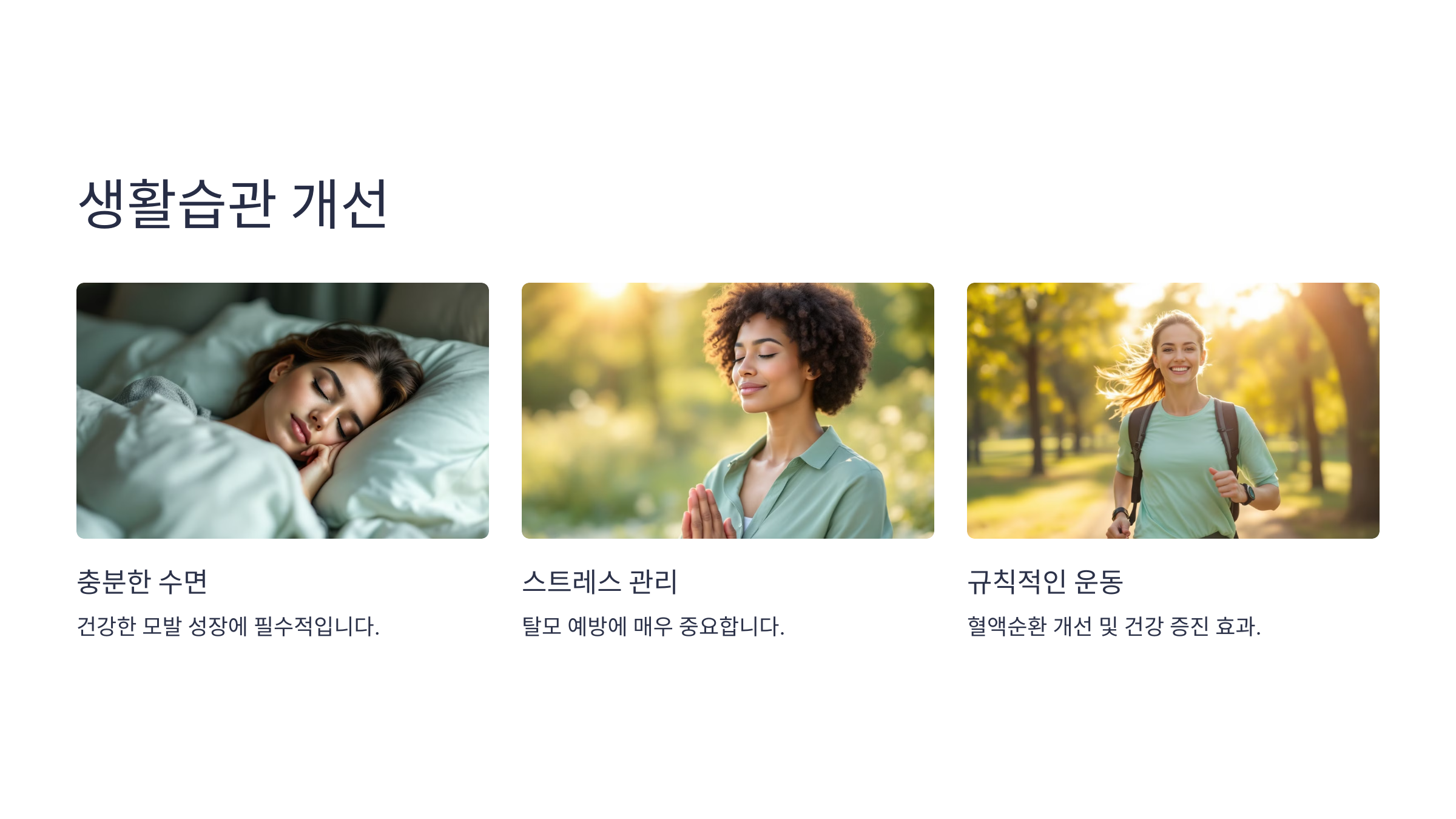 A: 균형 잡힌 식단, 스트레스 관리, 그리고 정기적인 두피 관리가 필요합니다.