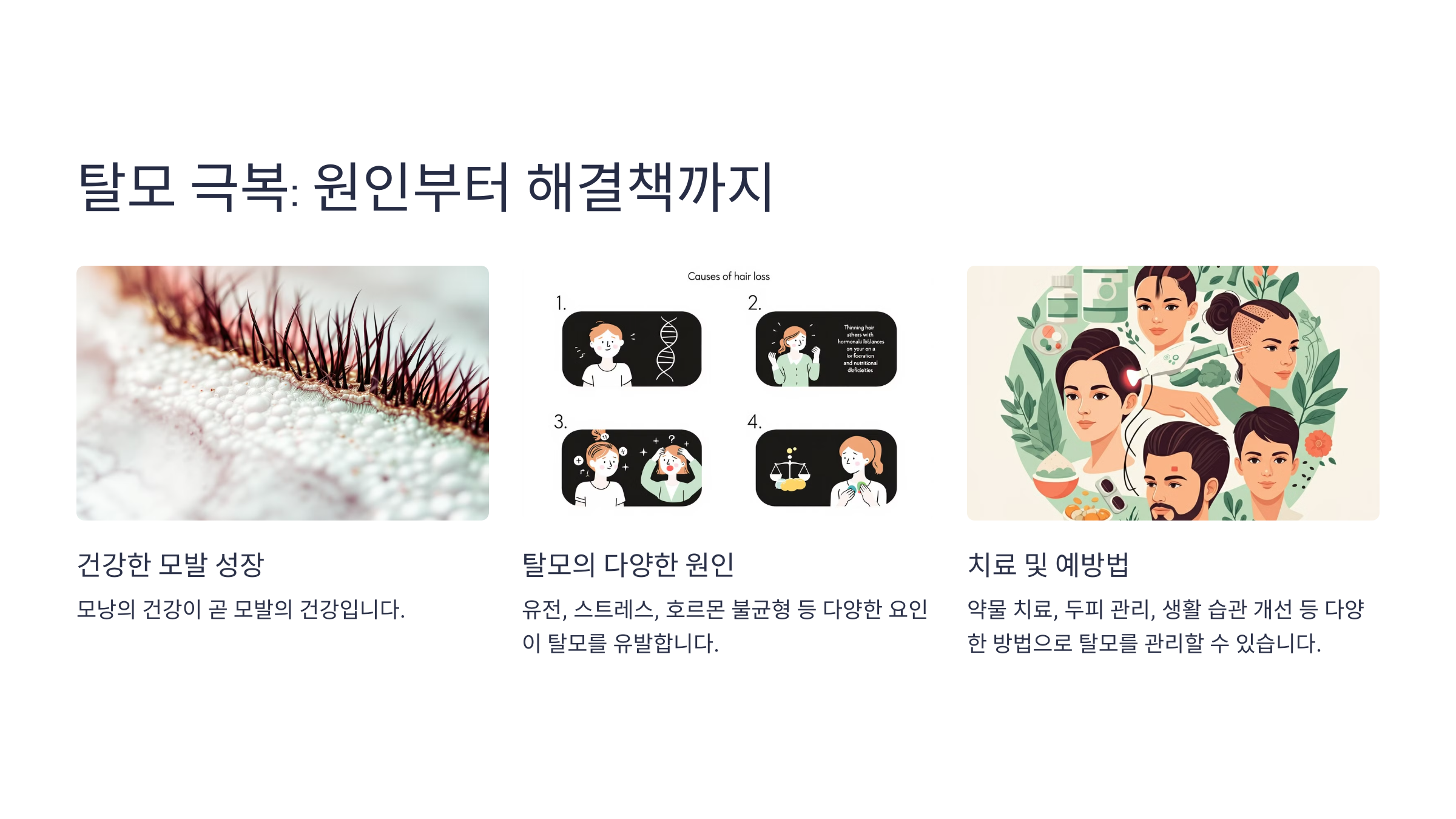 탈모는 유전적 요인, 스트레스, 호르몬 변화 등 여러 원인에 의해 발생할 수 있습니다.