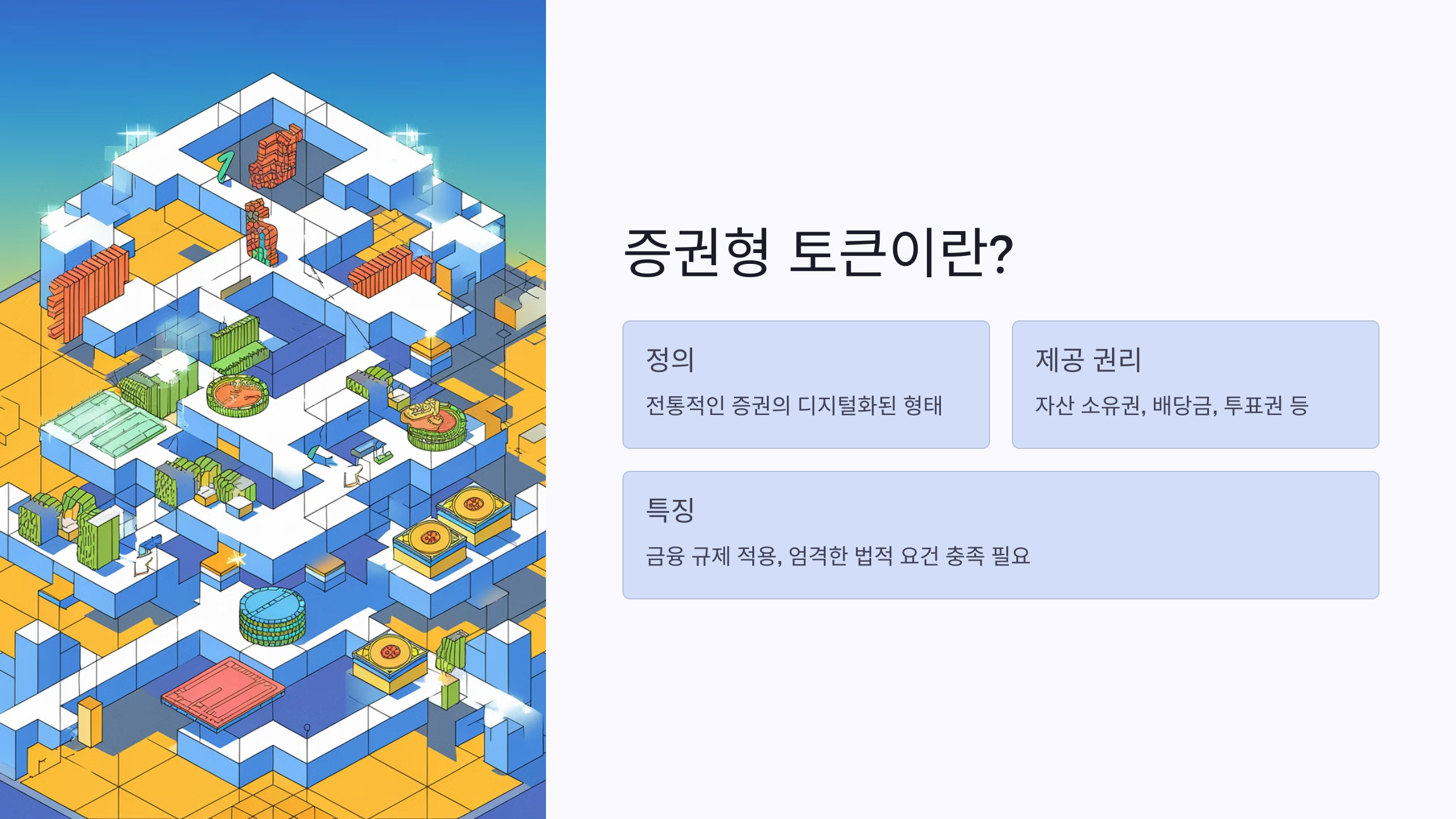 증권형 토큰은 전통적 증권을 디지털화한 자산으로, 소유권, 배당금, 또는 투표권을 제공합니다.