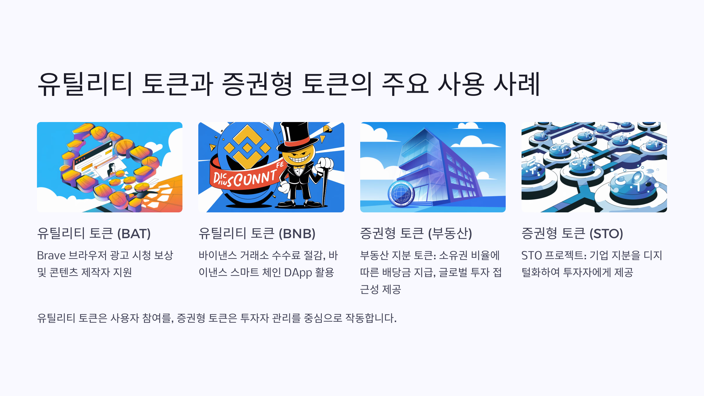 유틸리티 토큰은 플랫폼의 활성화를 촉진하는 역할을 하며, 증권형 토큰은 자금 조달 및 소유권 증명에 중점을 둡니다.