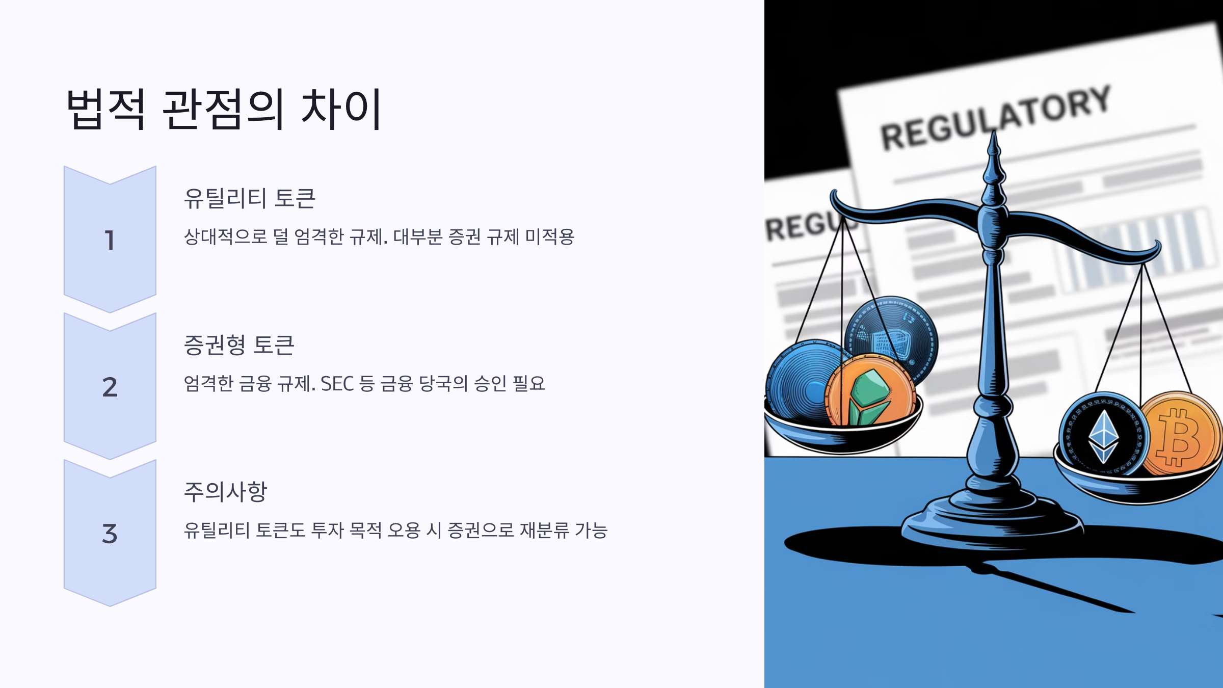 유틸리티 토큰은 법적으로 증권으로 간주되지 않으나, 증권형 토큰은 전통적인 증권과 동일한 규제를 받습니다.