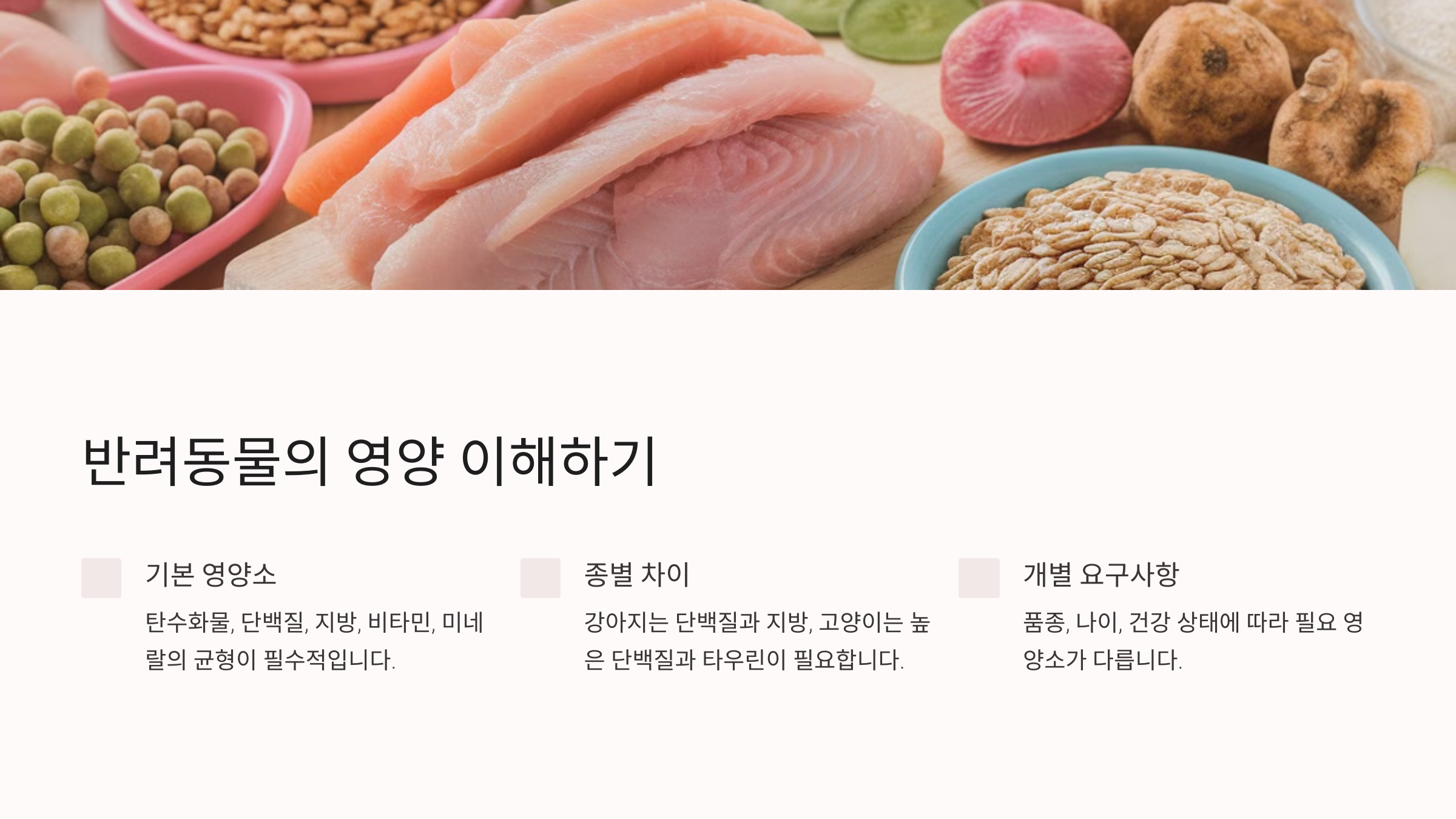 반려동물의 건강을 위해서는 기본적인 영양소에 대한 이해가 필요합니다. 탄수화물, 단백질, 지방, 비타민, 미네랄 등 균형 잡힌 영양소가 필수적입니다.
