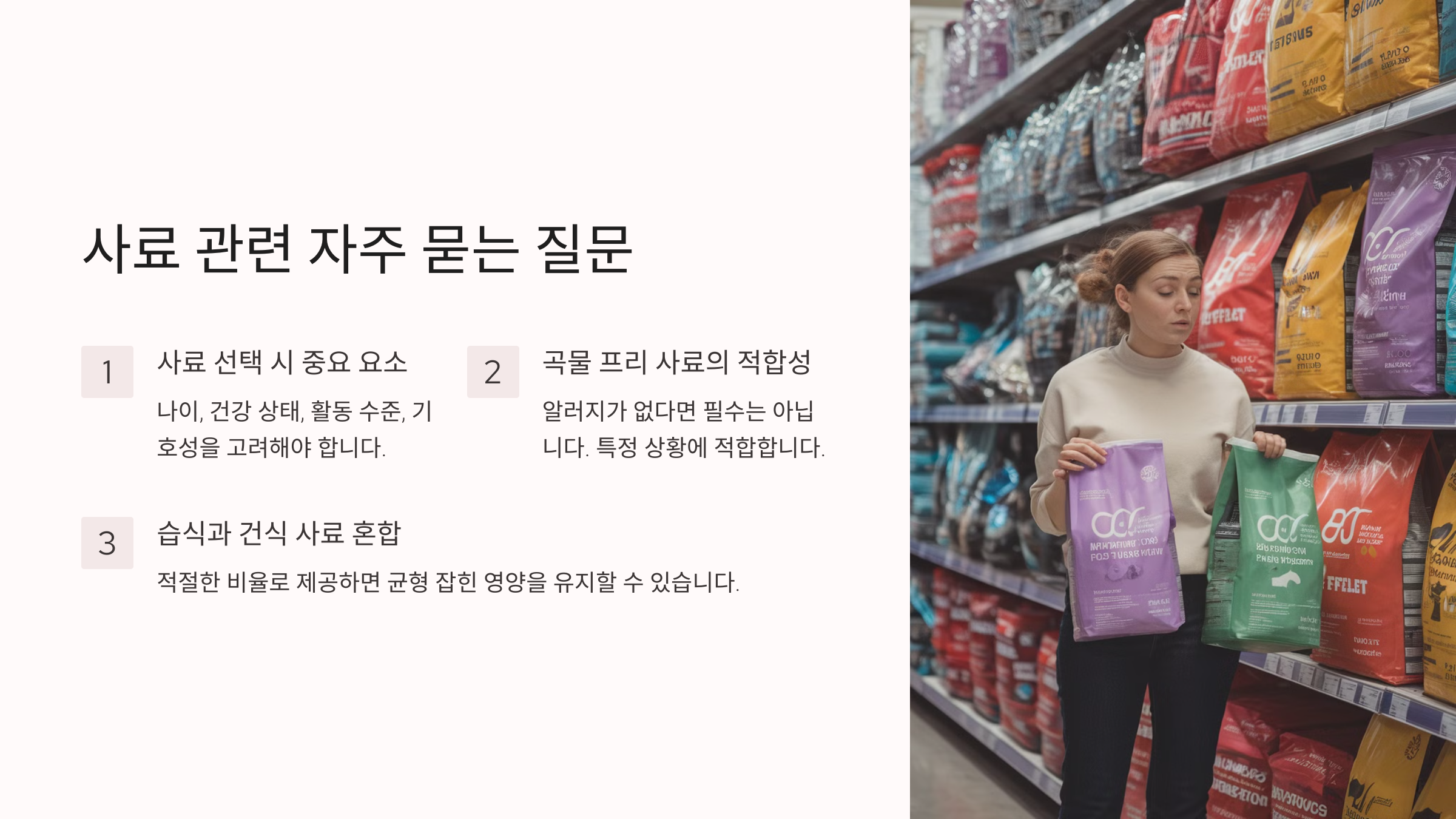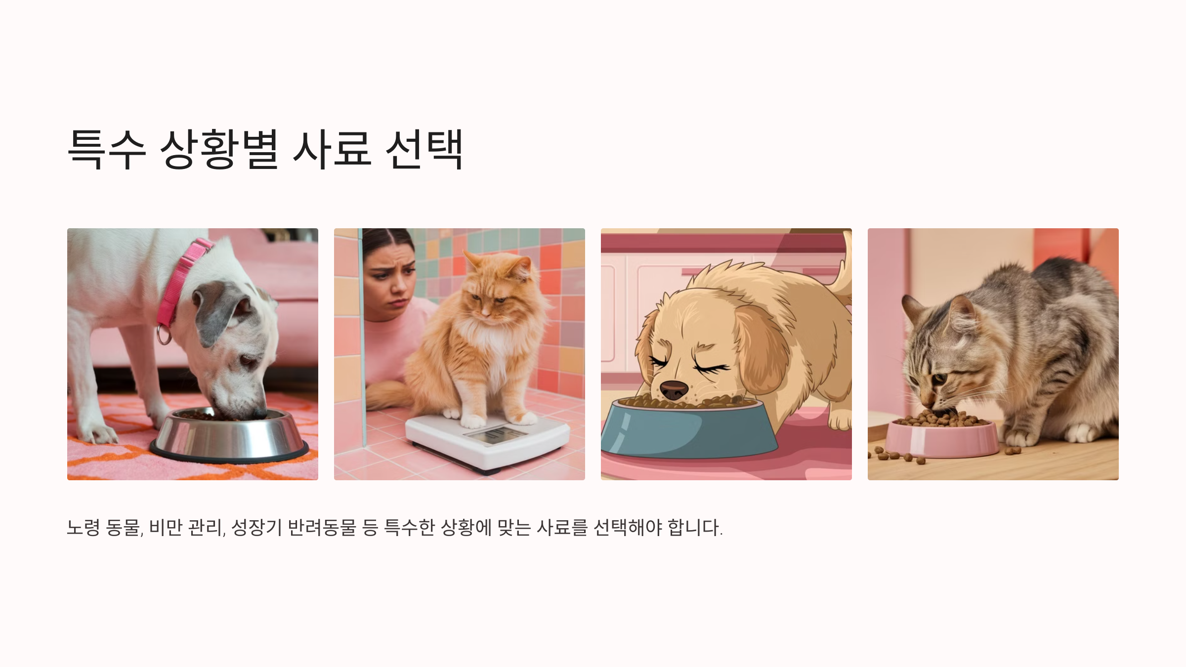 사료 선택 시 반려동물의 선호도, 건강 상태, 생활 습관을 고려하는 것이 중요합니다.