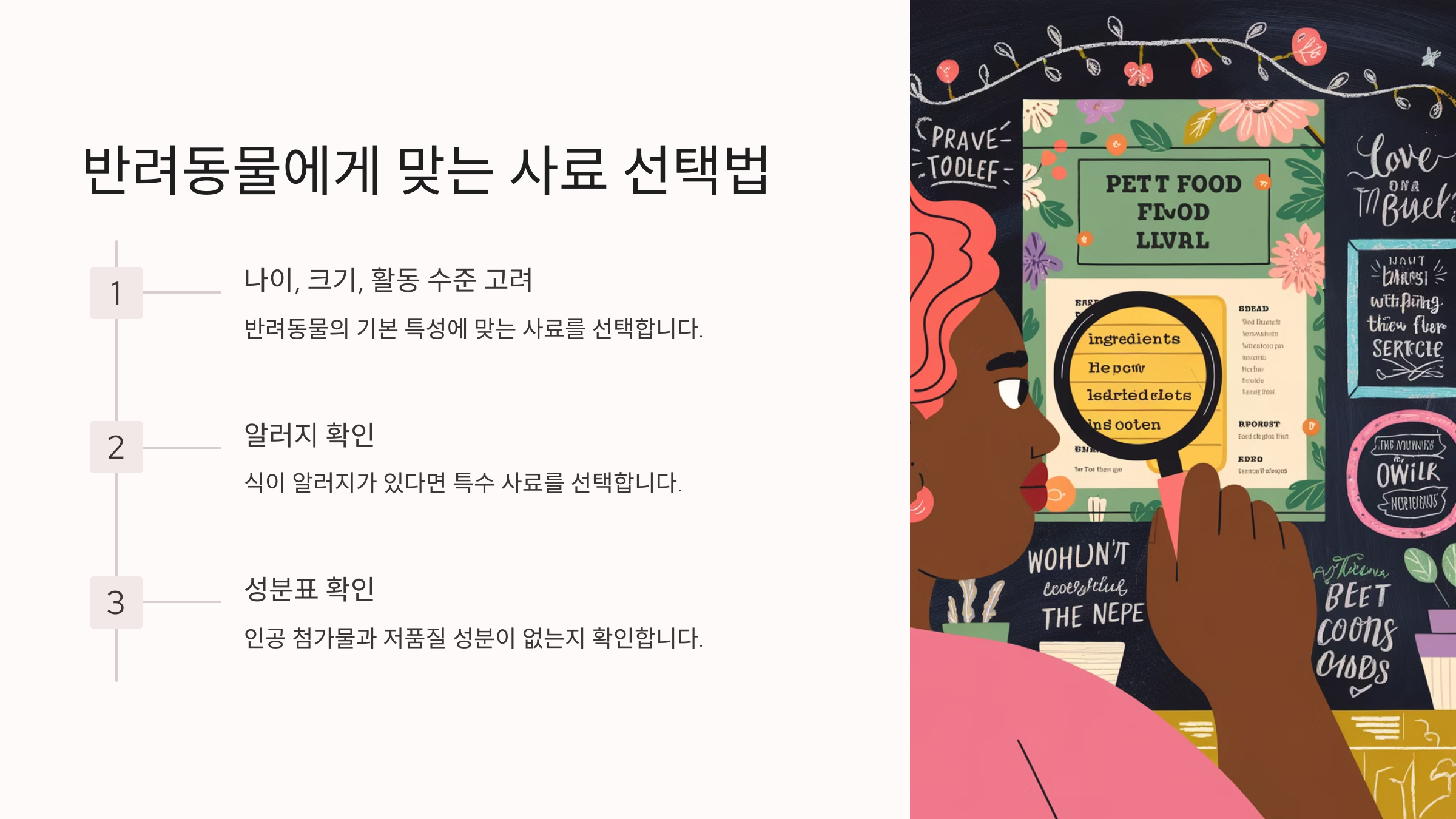 사료를 선택할 때 성분표를 꼼꼼히 확인하여 인공 첨가물과 저품질 성분이 포함되지 않았는지 확인해야 합니다.