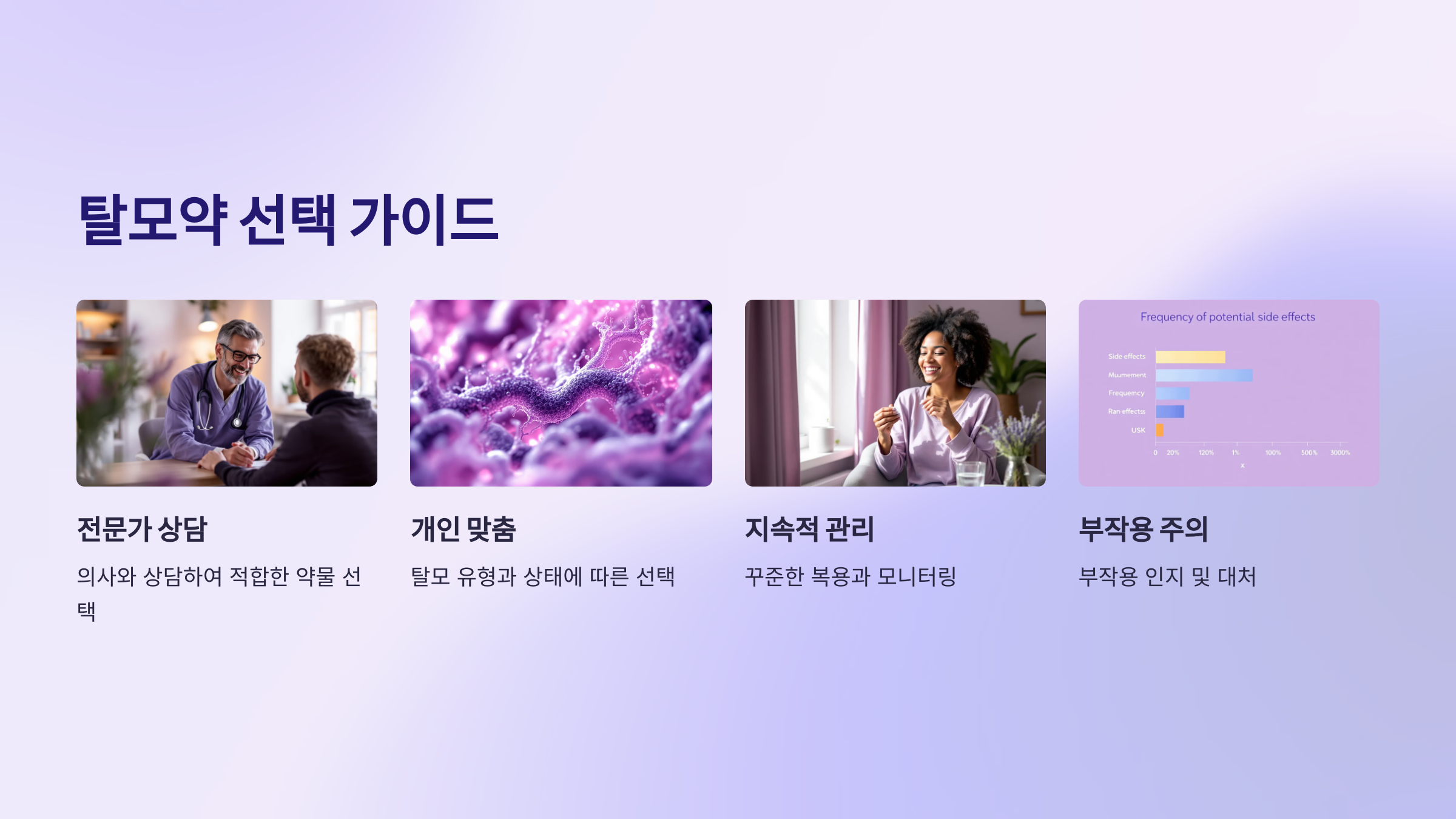 각 약물은 개인의 상태와 탈모 유형에 따라 선택해야 합니다.