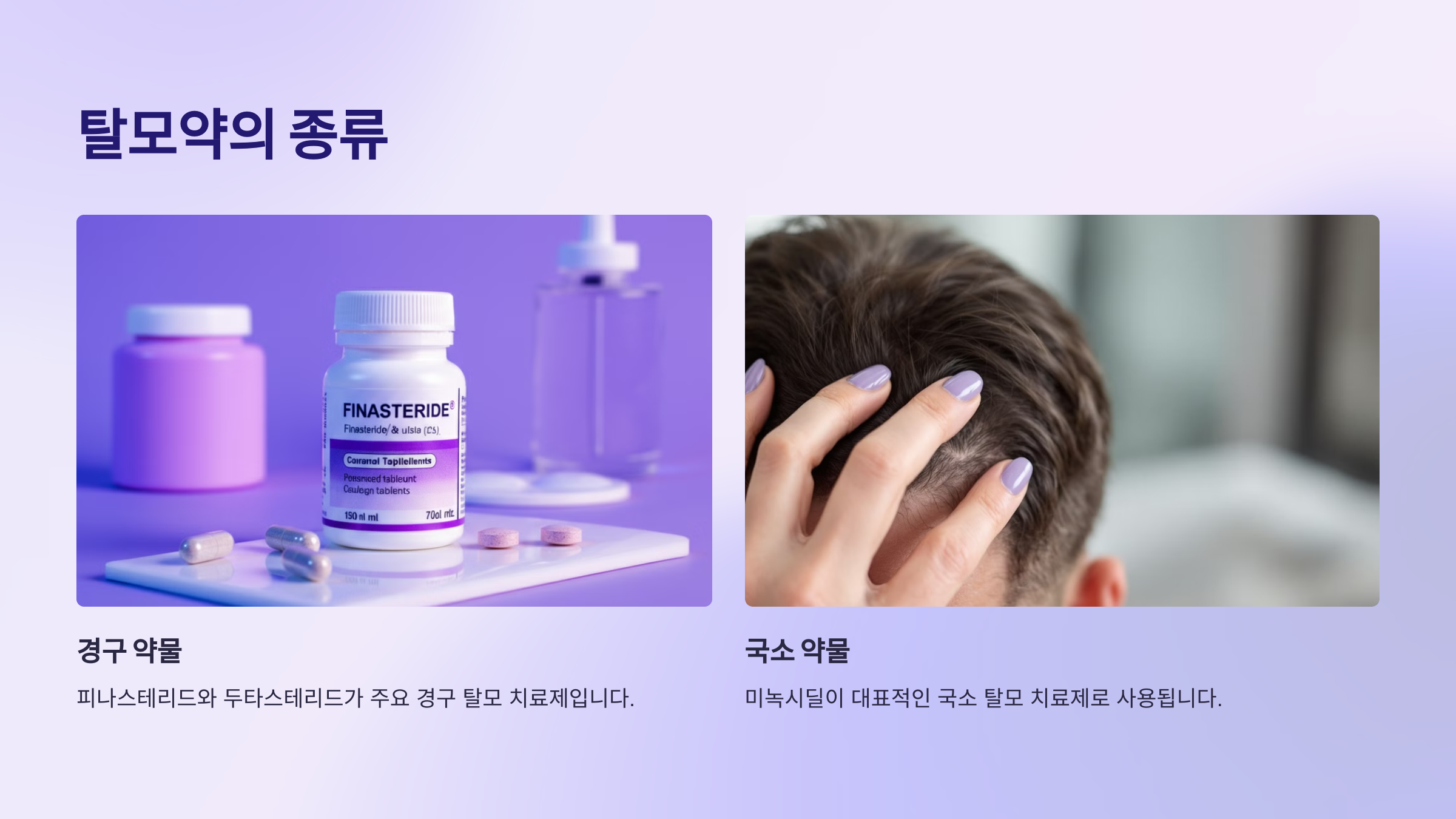 탈모 치료제는 주로 경구 약물과 국소 약물로 나뉩니다.
