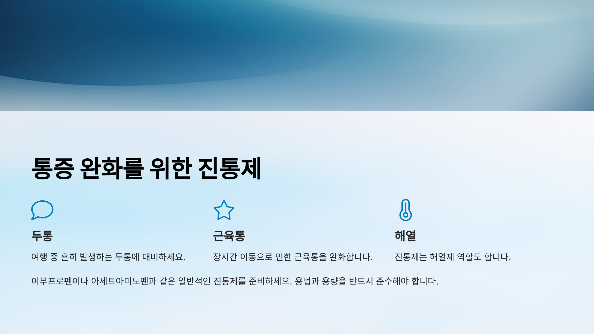해외여행 중에는 두통, 치통, 근육통과 같은 통증이 발생할 수 있습니다.