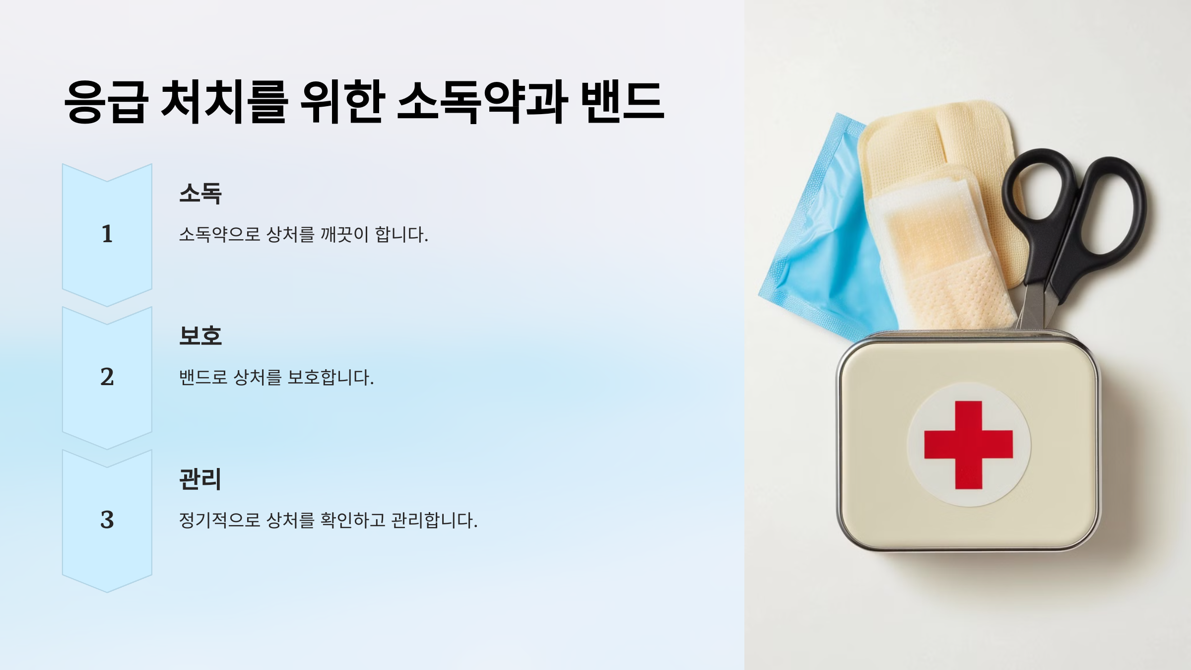 소독약과 밴드는 감염을 예방하고 상처를 보호하는 데 유용합니다.
