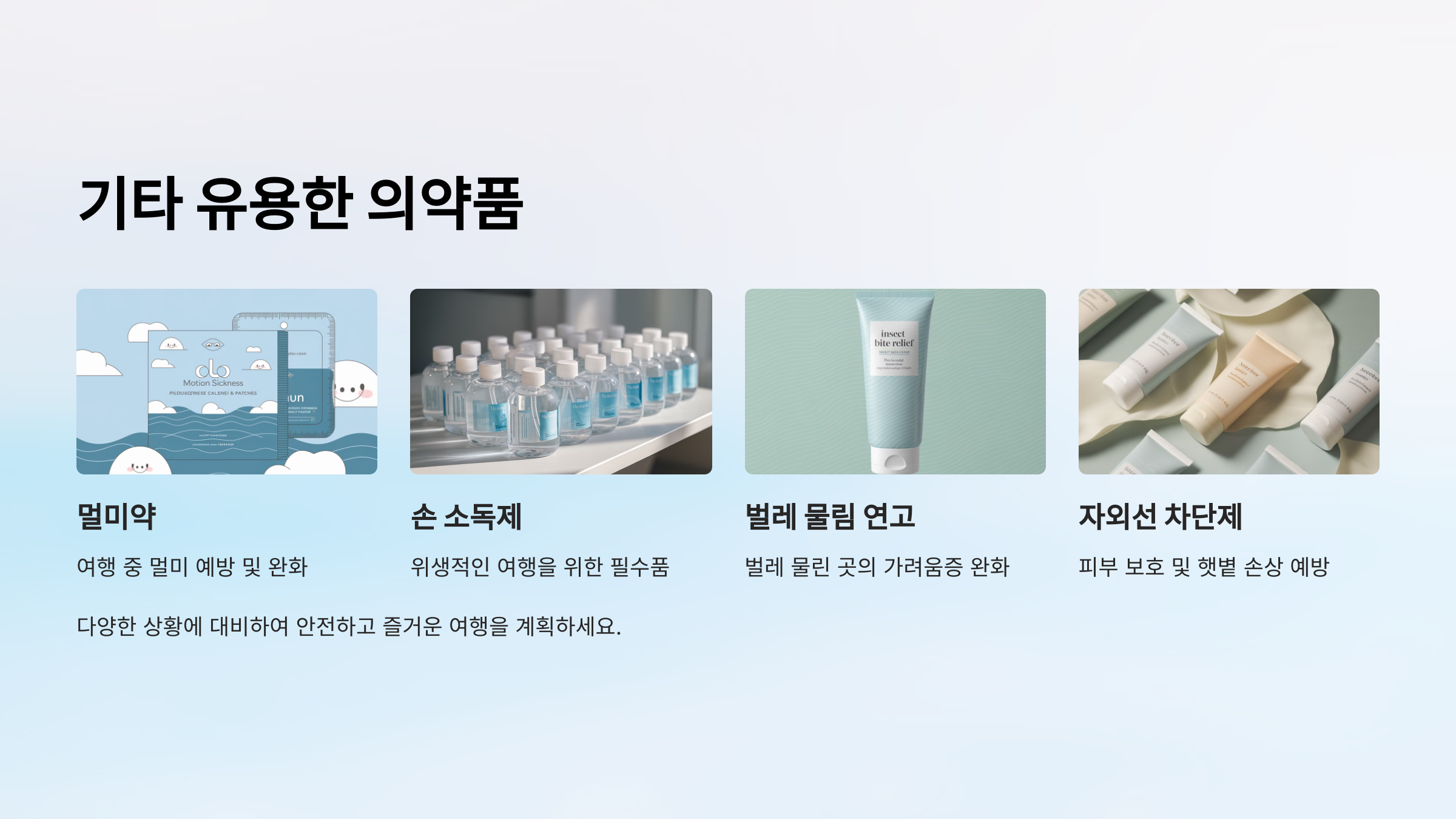 기타 유용한 의약품은 여행 중 갑작스러운 상황에 대비할 수 있게 합니다.