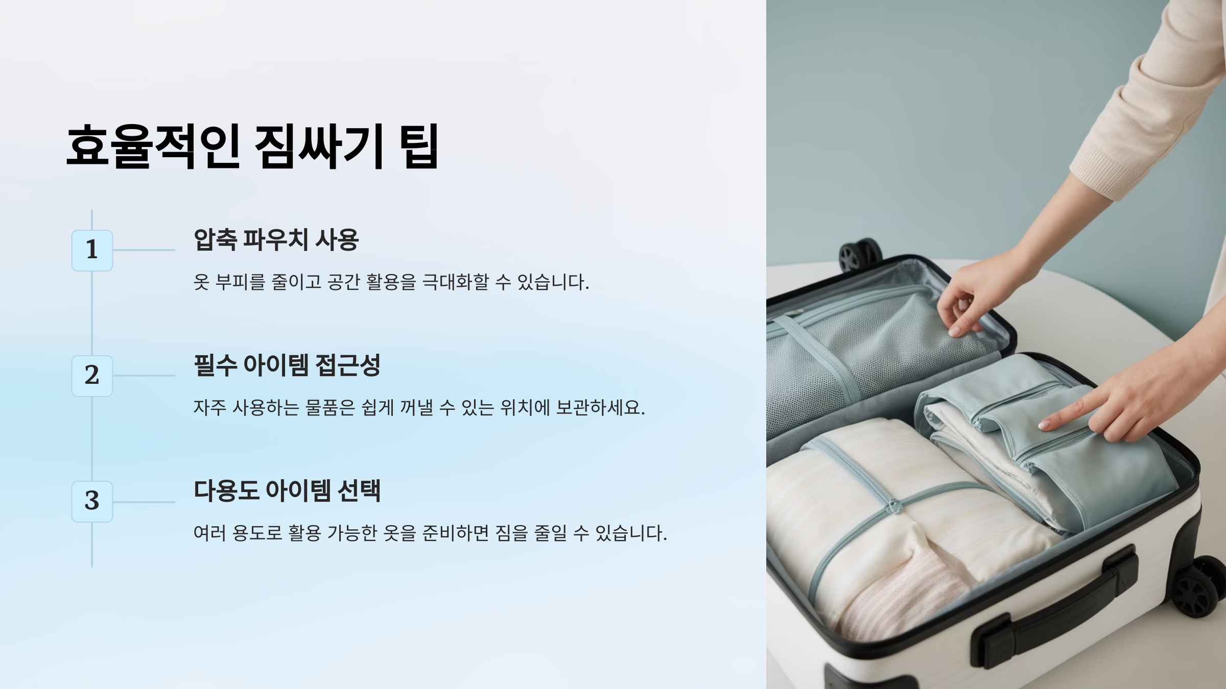 효율적인 짐싸기는 여행 중 짐의 무게와 부피를 줄이는 데 중요합니다.