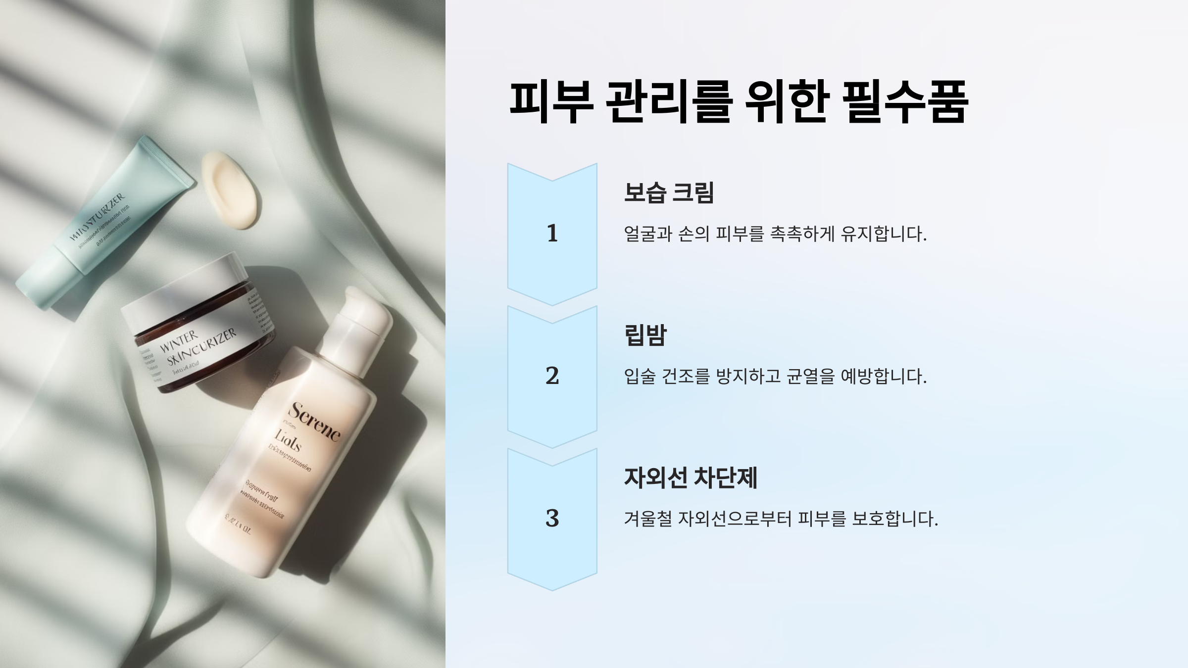 보습 크림, 립밤, SPF가 포함된 자외선 차단제를 준비하세요.