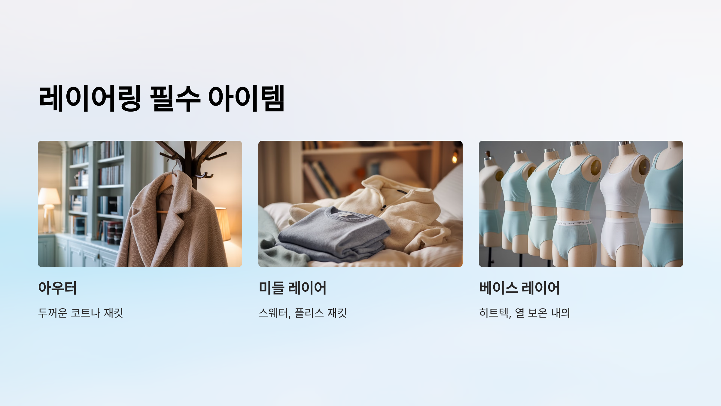 레이어링은 체온 조절과 보온성을 높이는 데 필수적입니다.