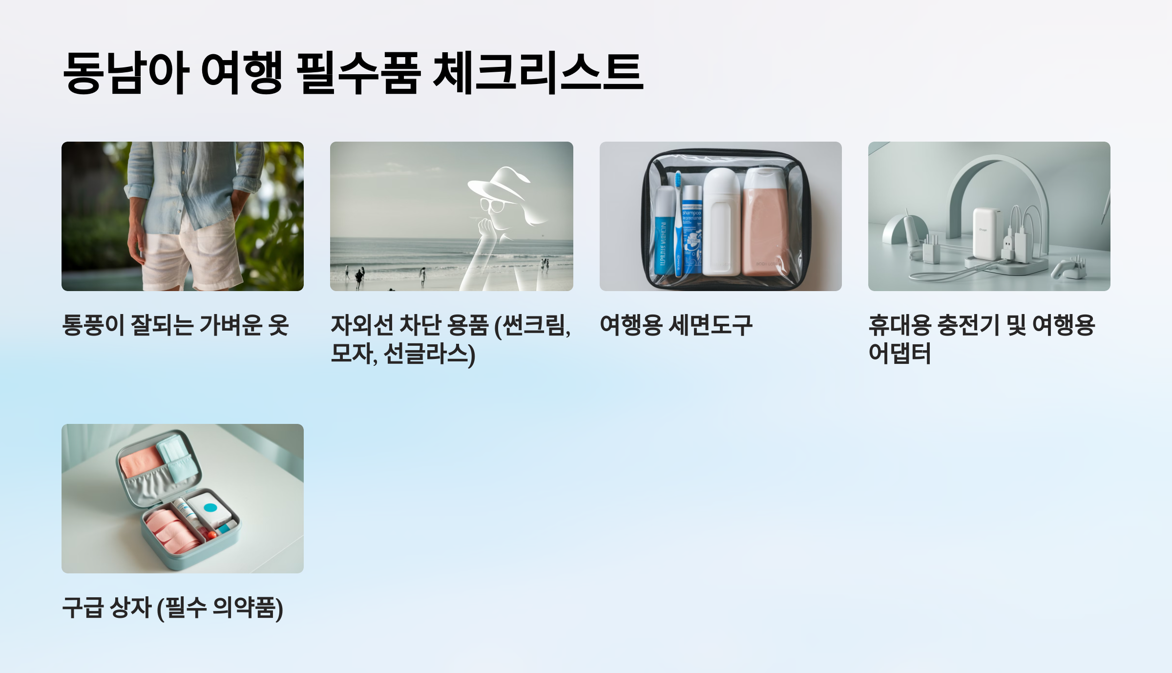 특히 옷, 위생용품, 전자 기기 등은 여행의 편안함과 안전을 좌우할 수 있습니다.