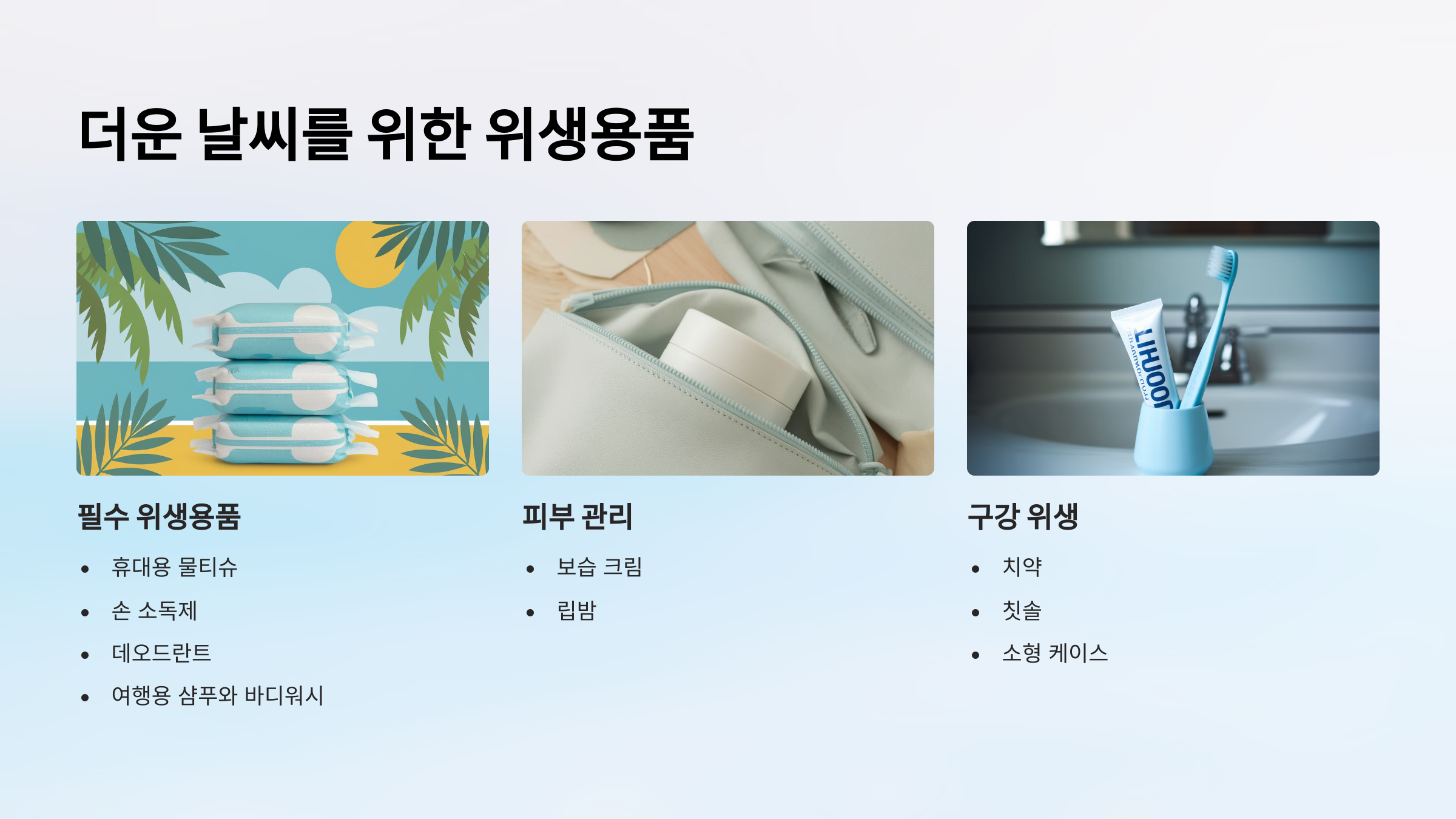 치약과 칫솔은 소형 케이스에 보관하여 위생적으로 사용하세요.