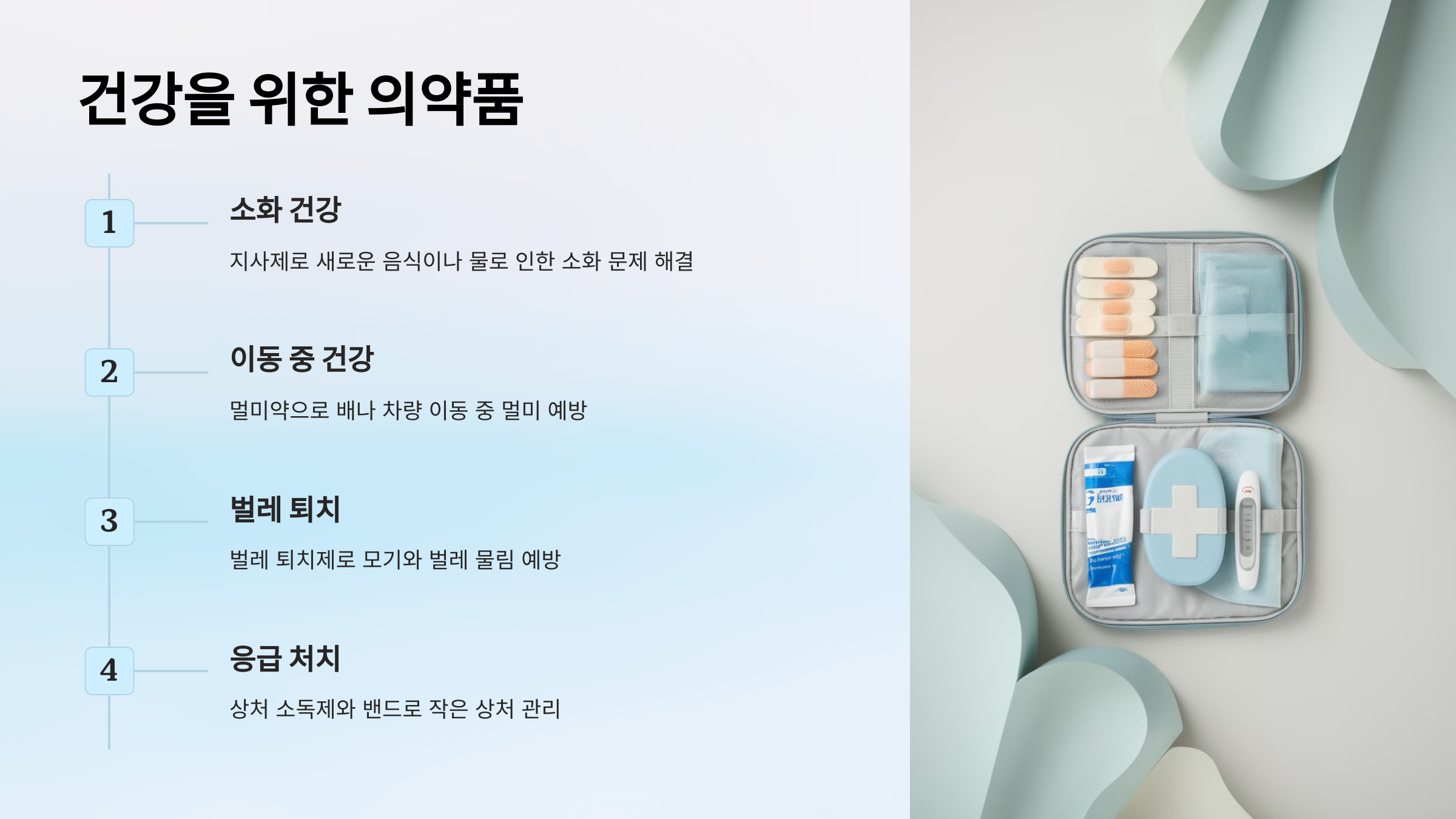 지사제, 멀미약, 해열제, 진통제를 챙기세요.