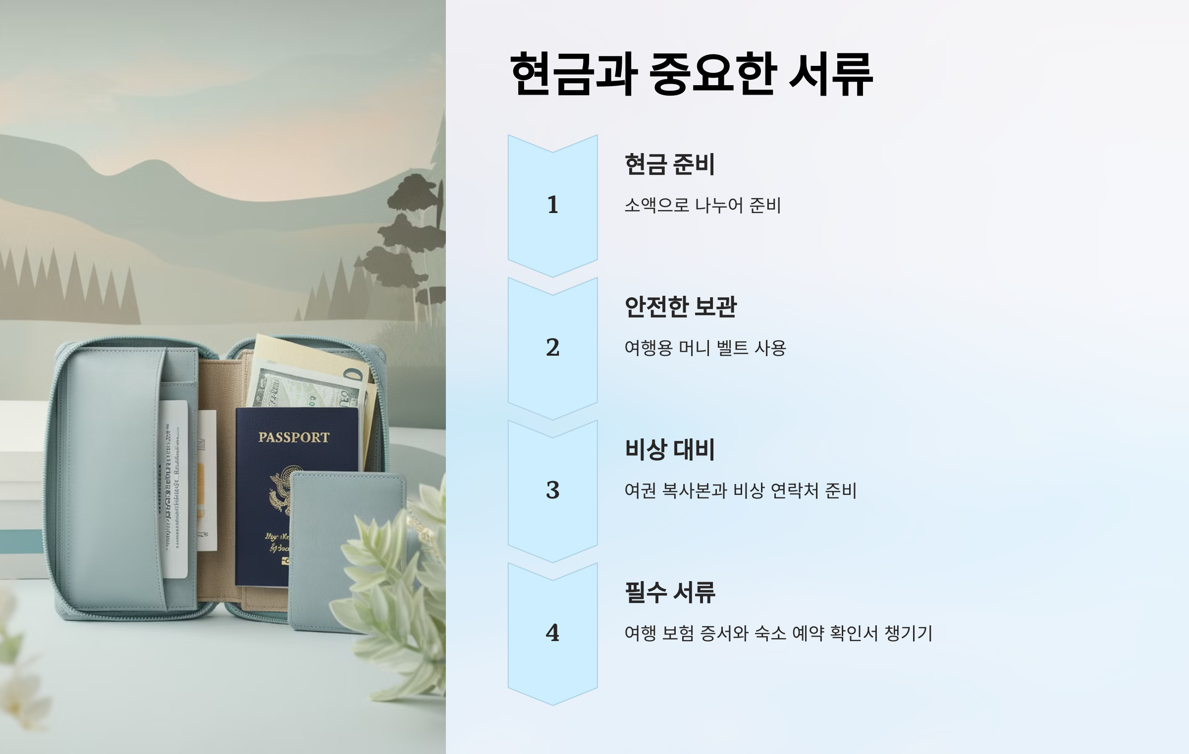 현금은 소액으로 나누어 준비하여 이동 중에도 편리하게 사용할 수 있습니다.