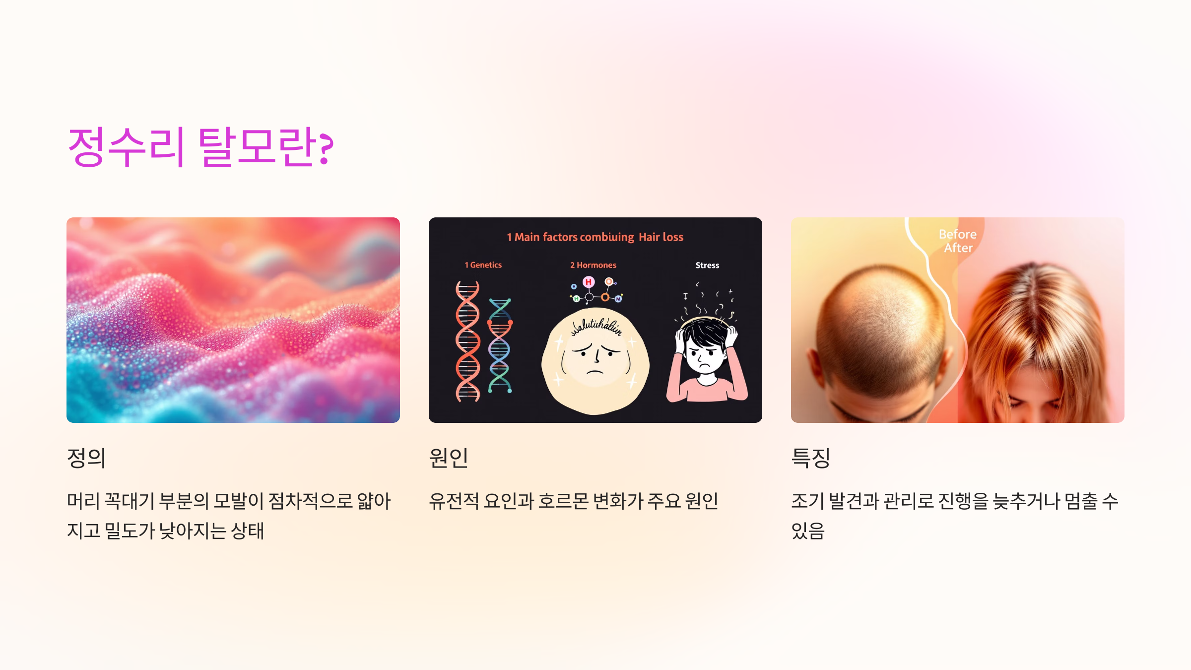 남성형 탈모의 한 형태로, 유전적 요인과 호르몬 변화가 주요 원인으로 꼽힙니다.