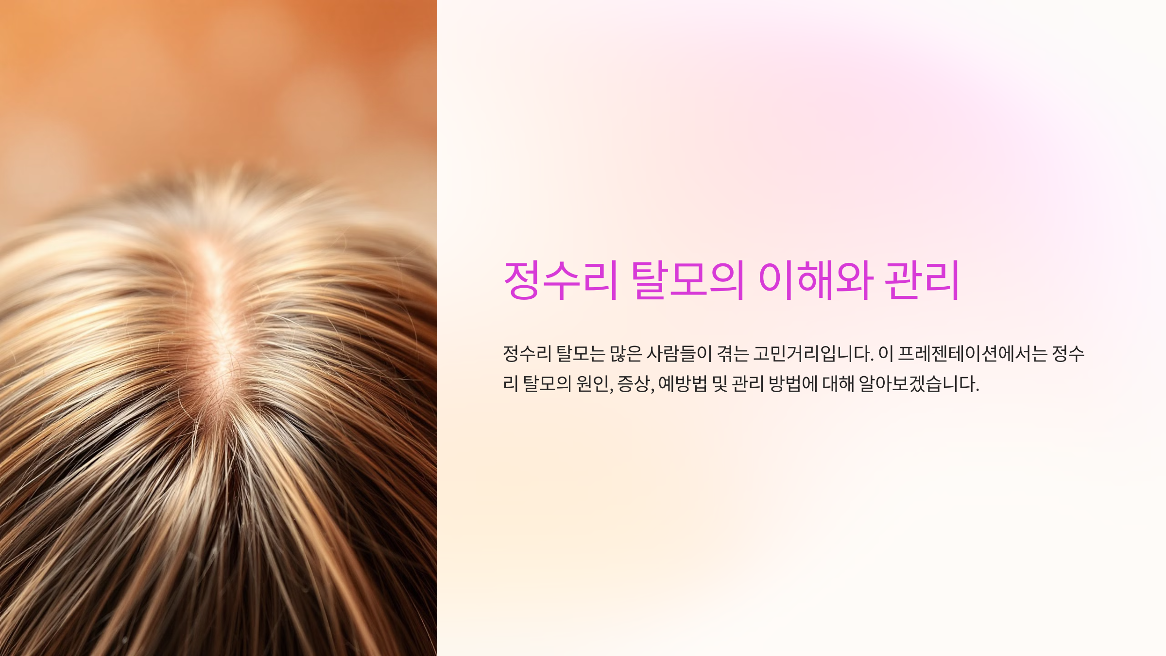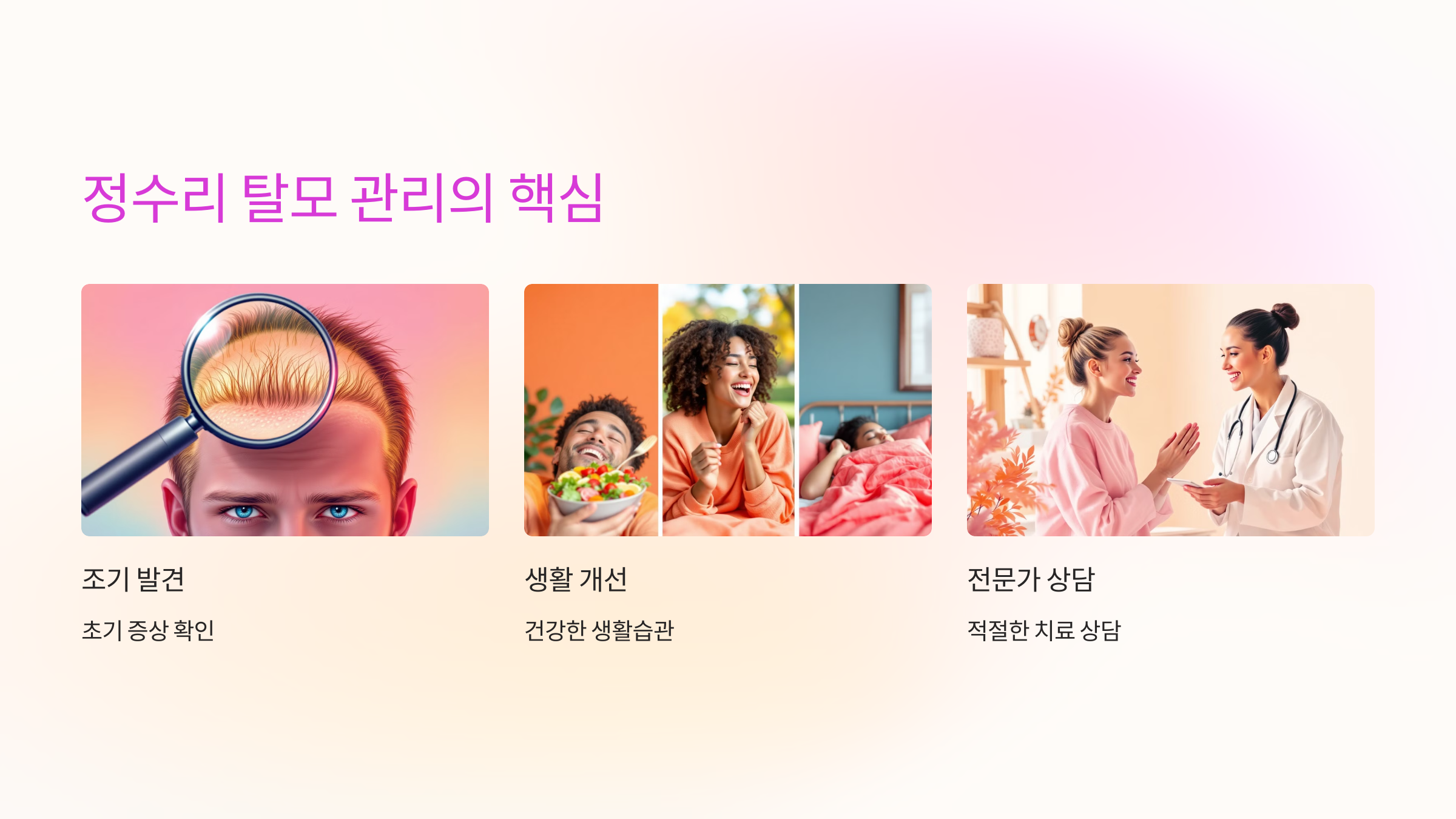 정수리 탈모는 초기 단계에서 적절히 관리하면 충분히 막을 수 있습니다. 생활습관 개선부터 전문적인 관리 방법까지, 정수리 탈모의 진행을 늦추고 건강한 두피와 모발을 유지하는 비법을 공개합니다.