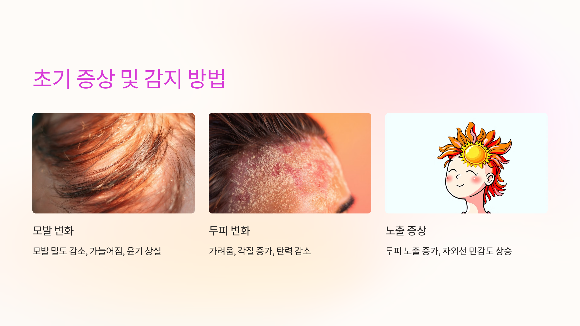 초기에는 두피가 드러나지 않지만, 점차적으로 탈모가 진행되면서 육안으로 확인할 수 있습니다.