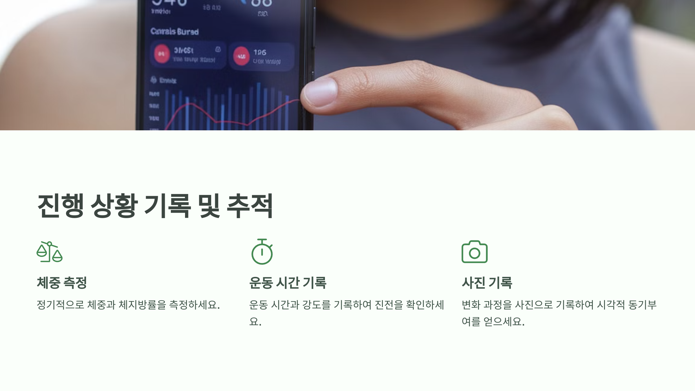 체중, 체지방률, 운동 시간, 강도 등을 주기적으로 측정하세요.