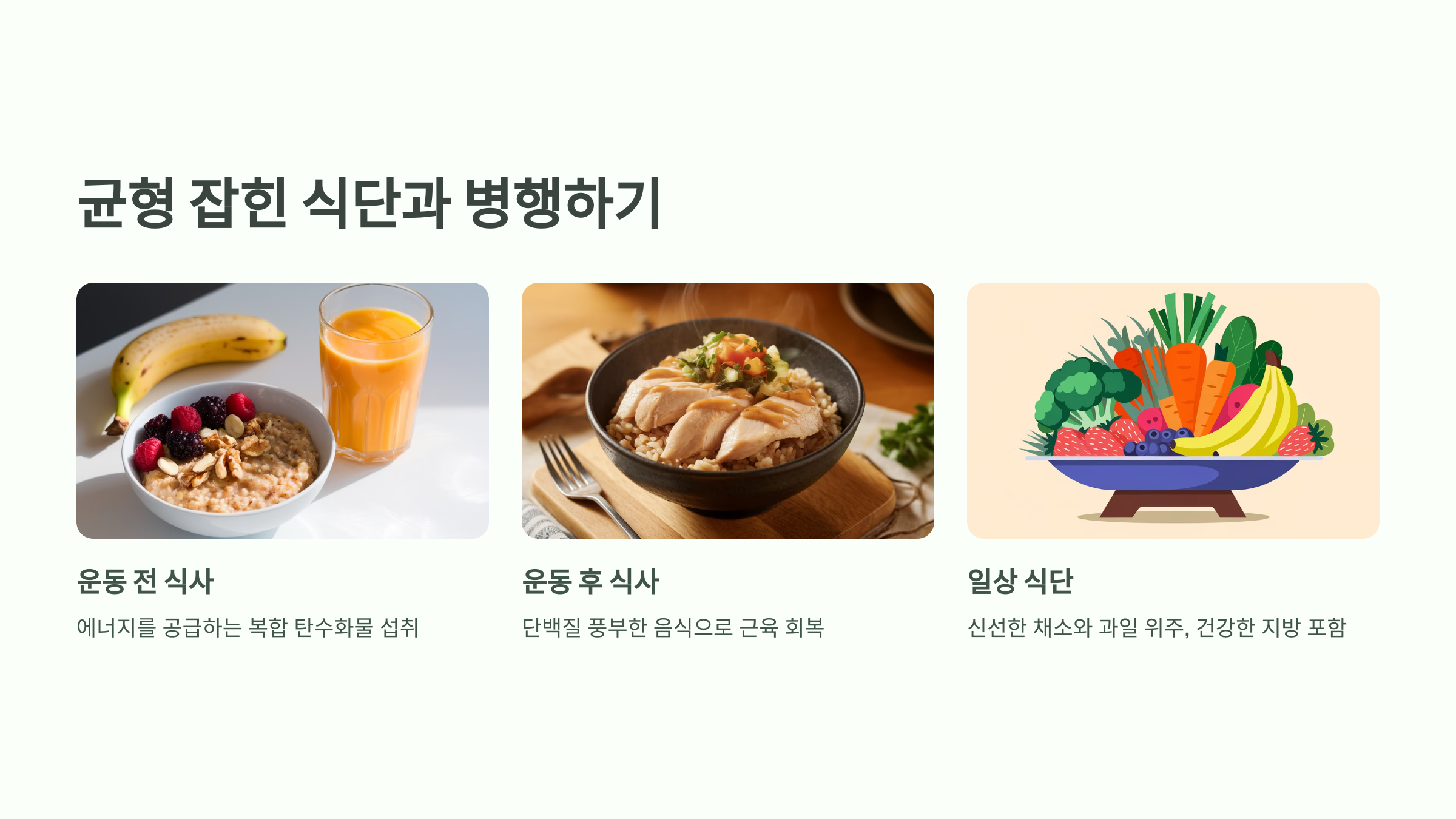 운동 효과를 극대화하려면 균형 잡힌 식단을 병행하는 것이 필수입니다.