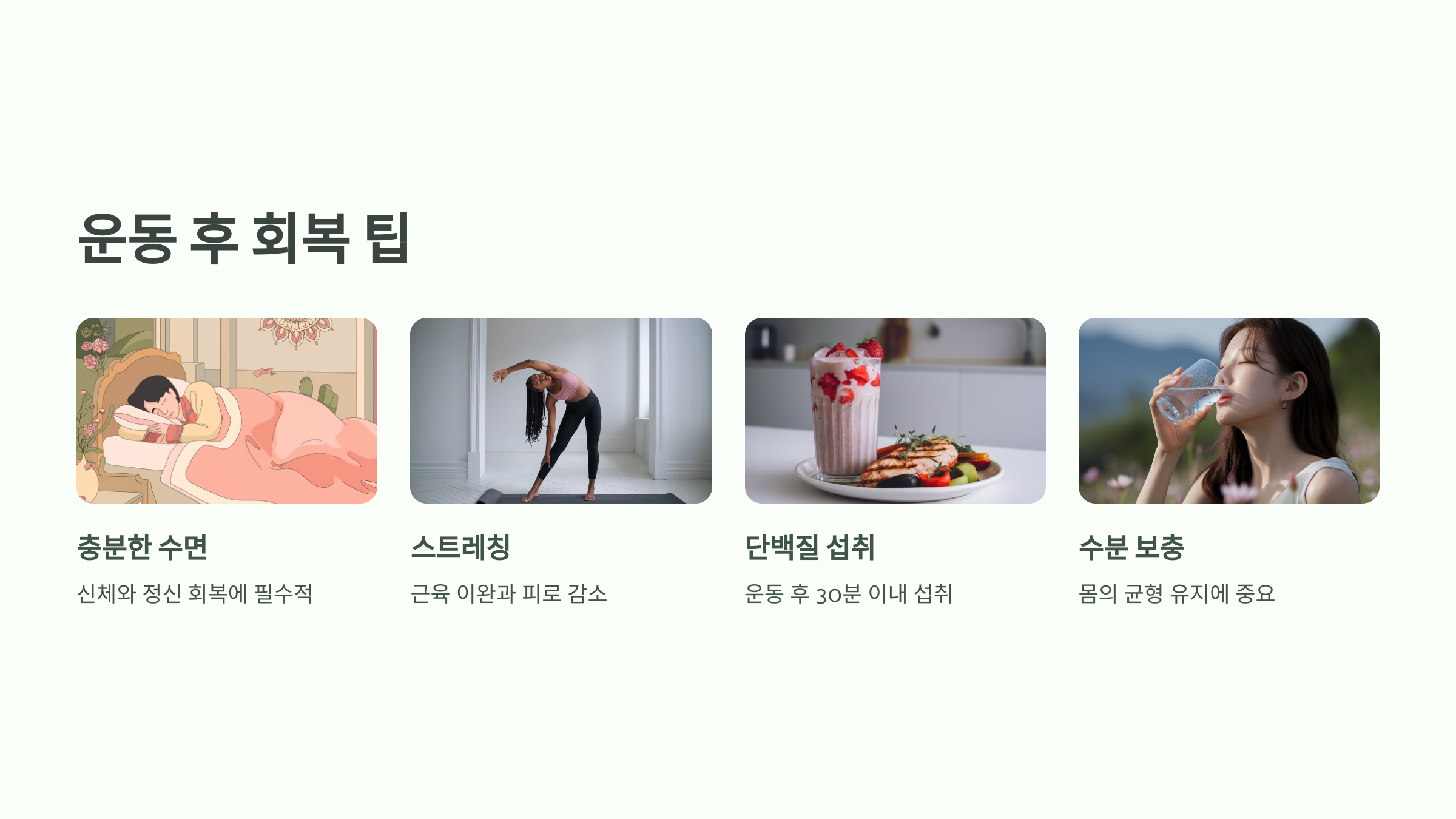 운동 후 30분 이내에 단백질을 섭취해 근육 회복을 촉진하세요.