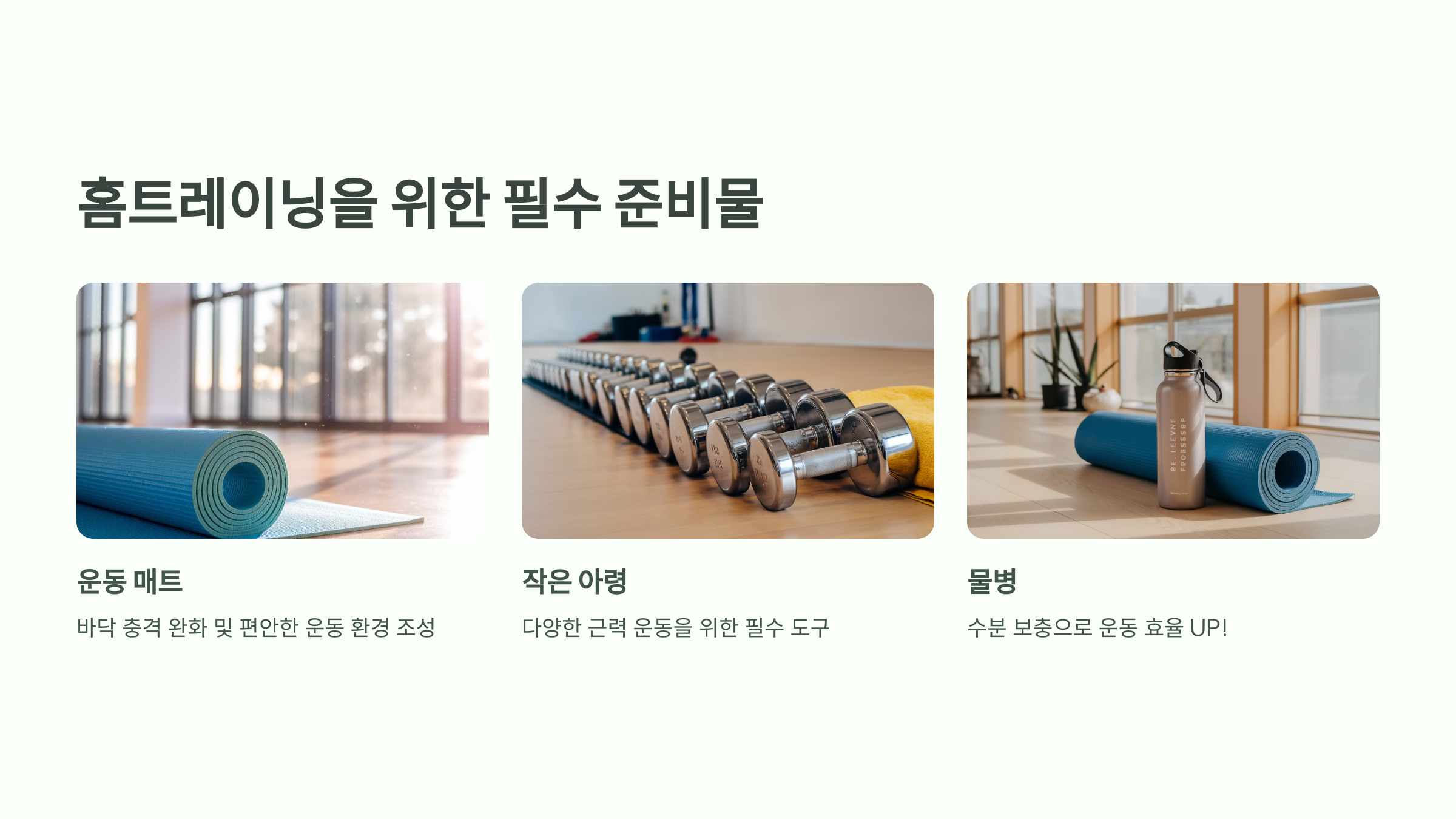 홈트레이닝을 시작하기 위해 필요한 준비물은 간단합니다.