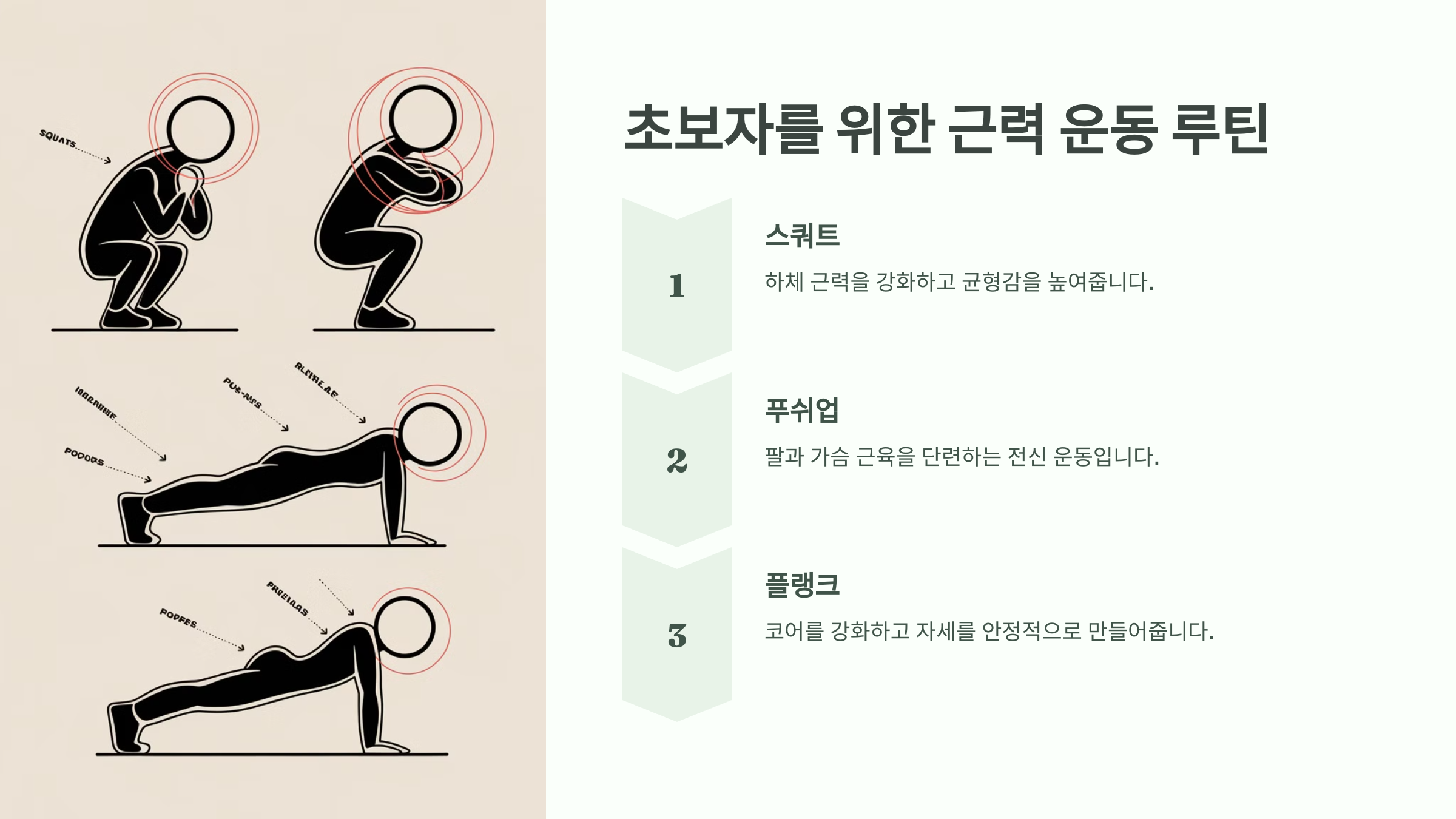 운동 강도를 서서히 높이고, 꾸준히 진행하며, 올바른 자세를 유지하세요.