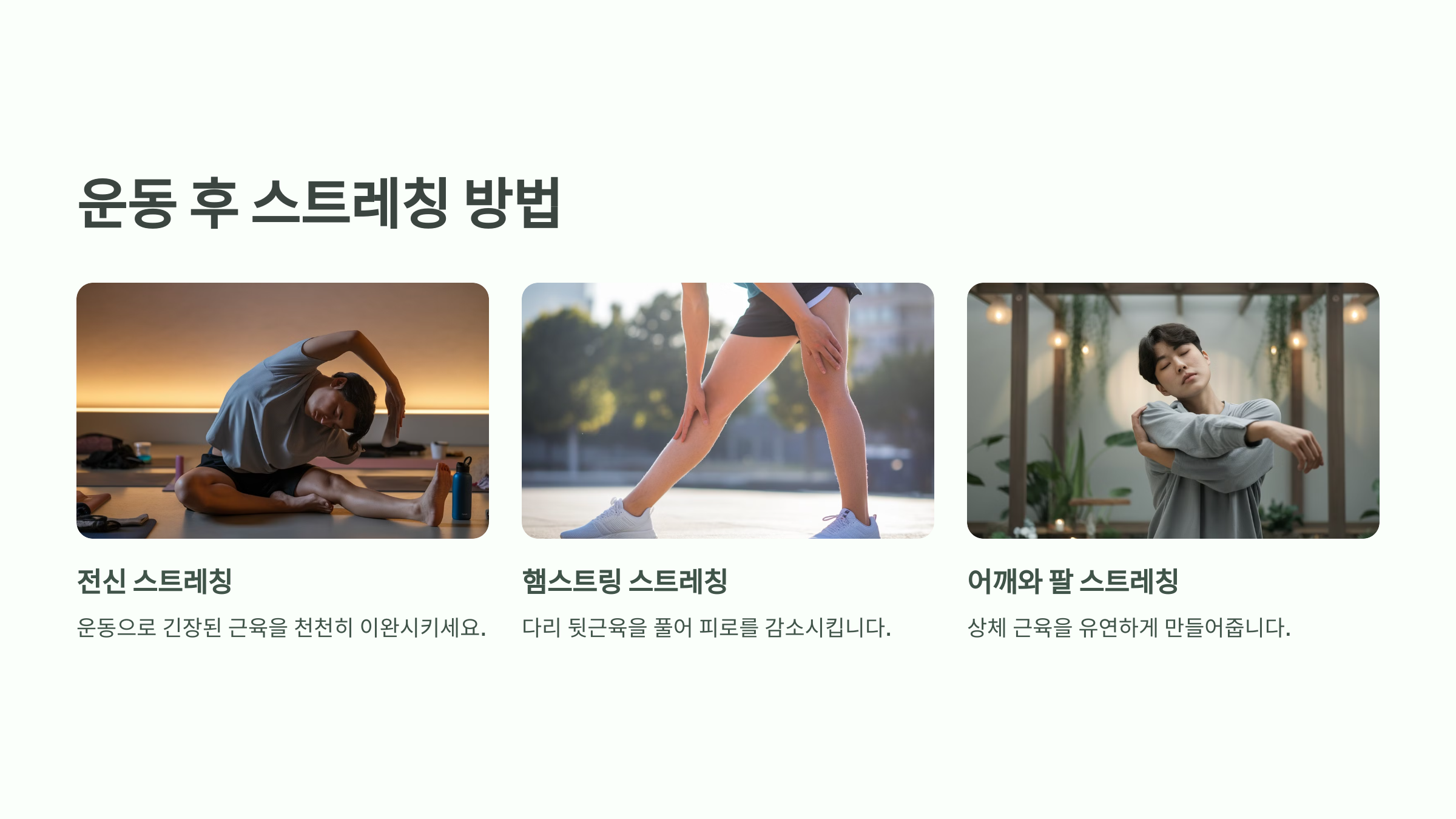 운동 후 스트레칭은 근육을 풀어주고 피로를 회복하는 데 필수적입니다.