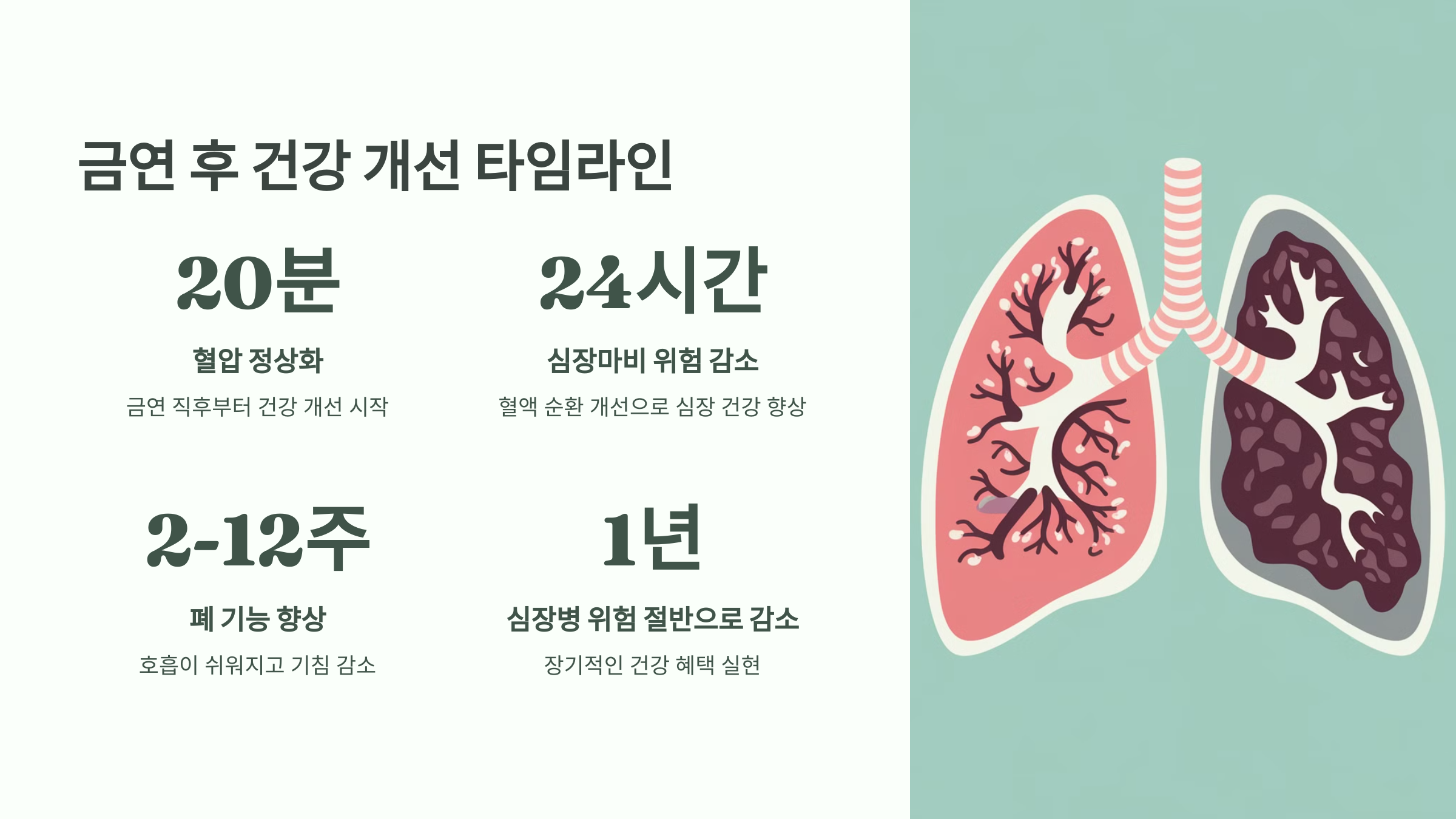 금연 시작 후몇 시간 내로 건강 개선 효과가 나타나며, 장기적으로 더 많은 혜택을 경험합니다.