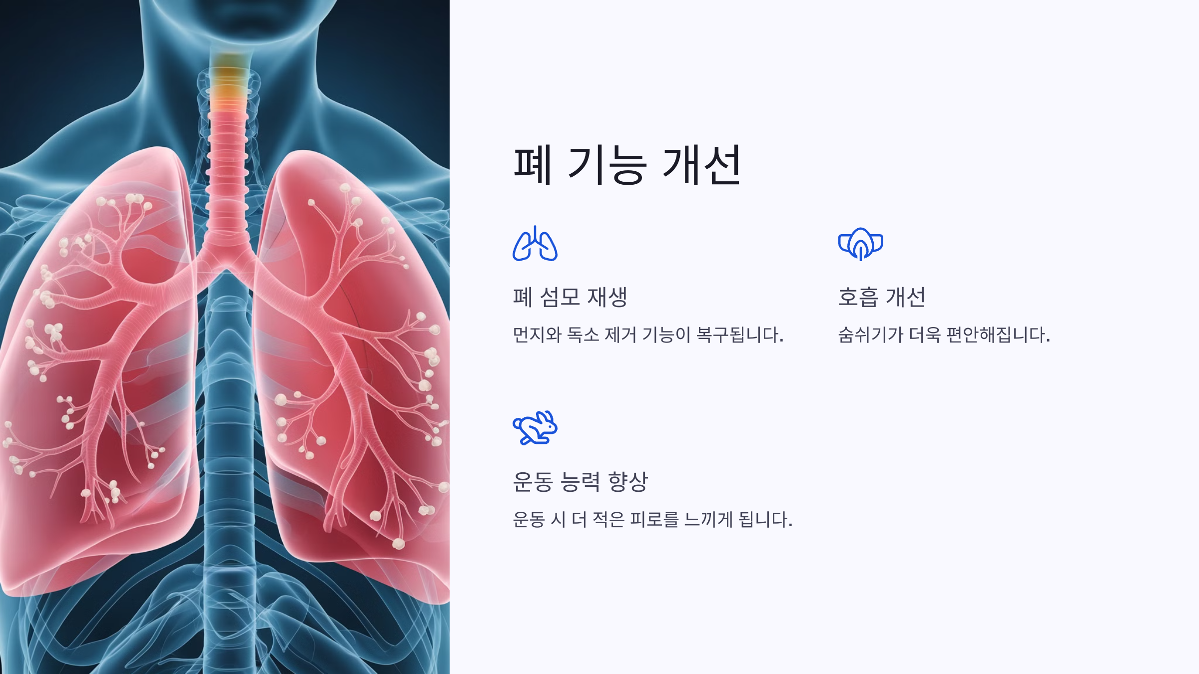 흡연으로 인해 손상되었던 폐 섬모가 재생되면서 먼지와 독소를 제거하는 기능이 복구됩니다.