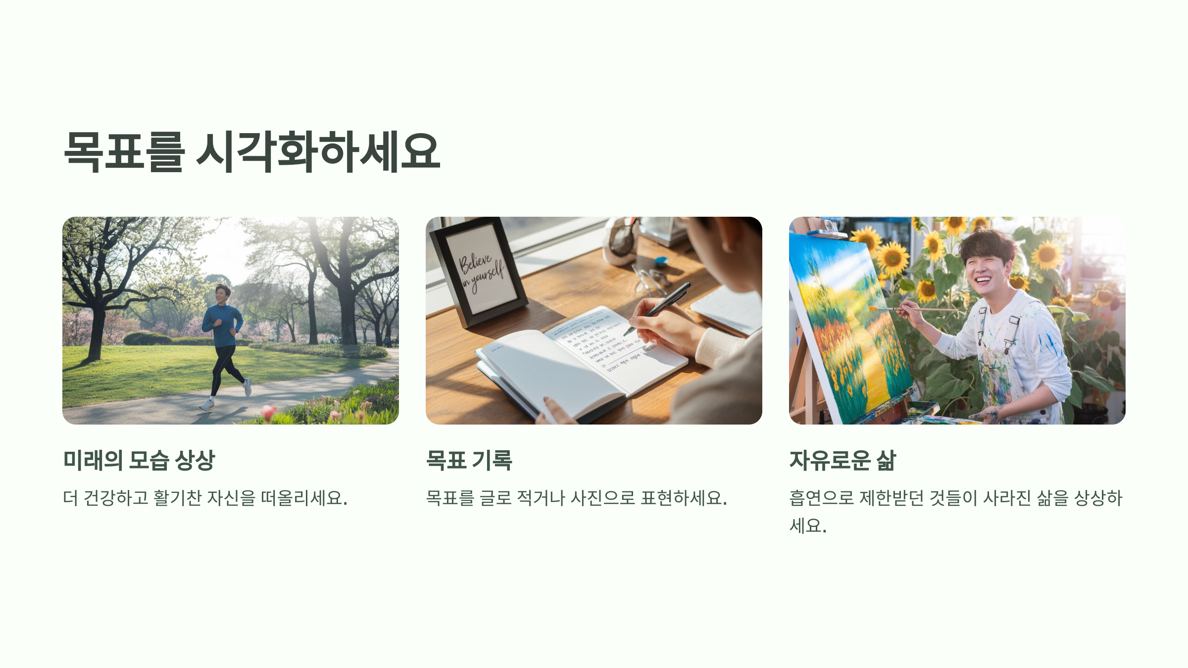 금연 후의 당신의 모습을 상상해보세요. 더 건강하고 활기찬 자신을 떠올리며 동기를 되새겨보세요.