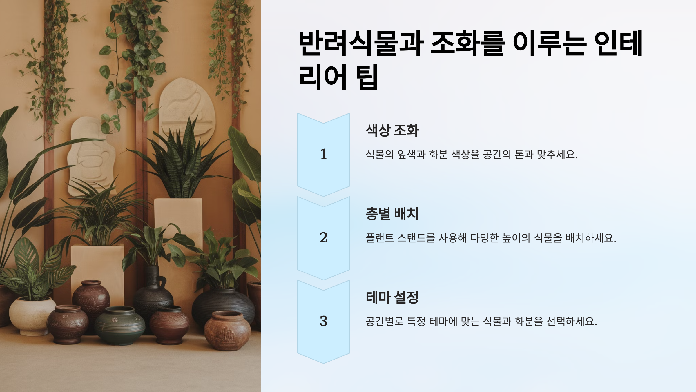 색상 조화: 식물의 잎색과 화분 색상을 공간의 톤과 맞추세요.