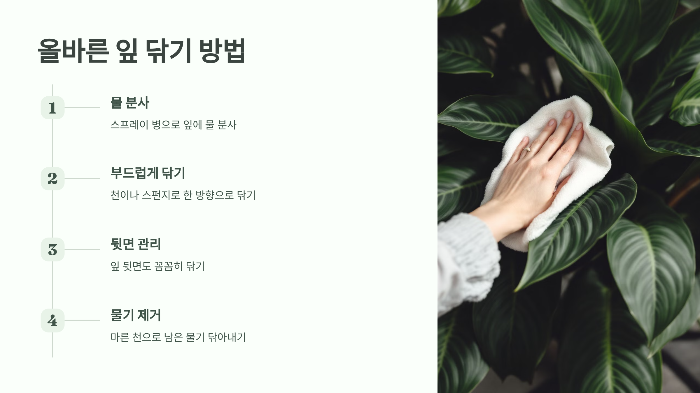 그 후, 부드러운 천이나 스펀지를 사용하여 잎 표면을 천천히 닦아줍니다. 한 방향으로 닦아내는 것이 잎 손상을 최소화하는 데 도움이 됩니다.
