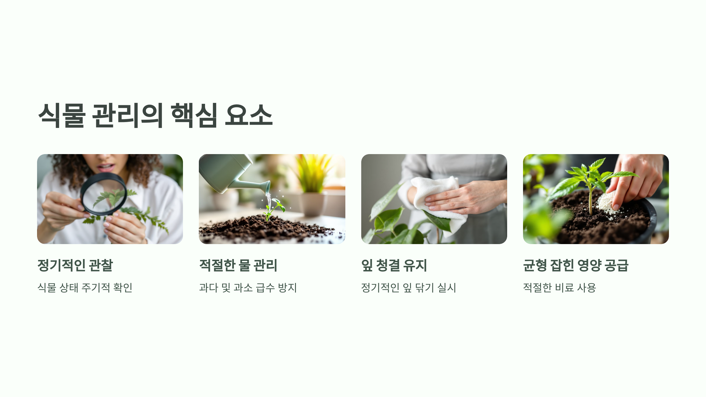 정기적인 잎 닦기는 식물의 건강을 유지하고, 병충해를 예방하며, 실내 환경의 미적 효과를 높이는 데 큰 역할을 합니다.