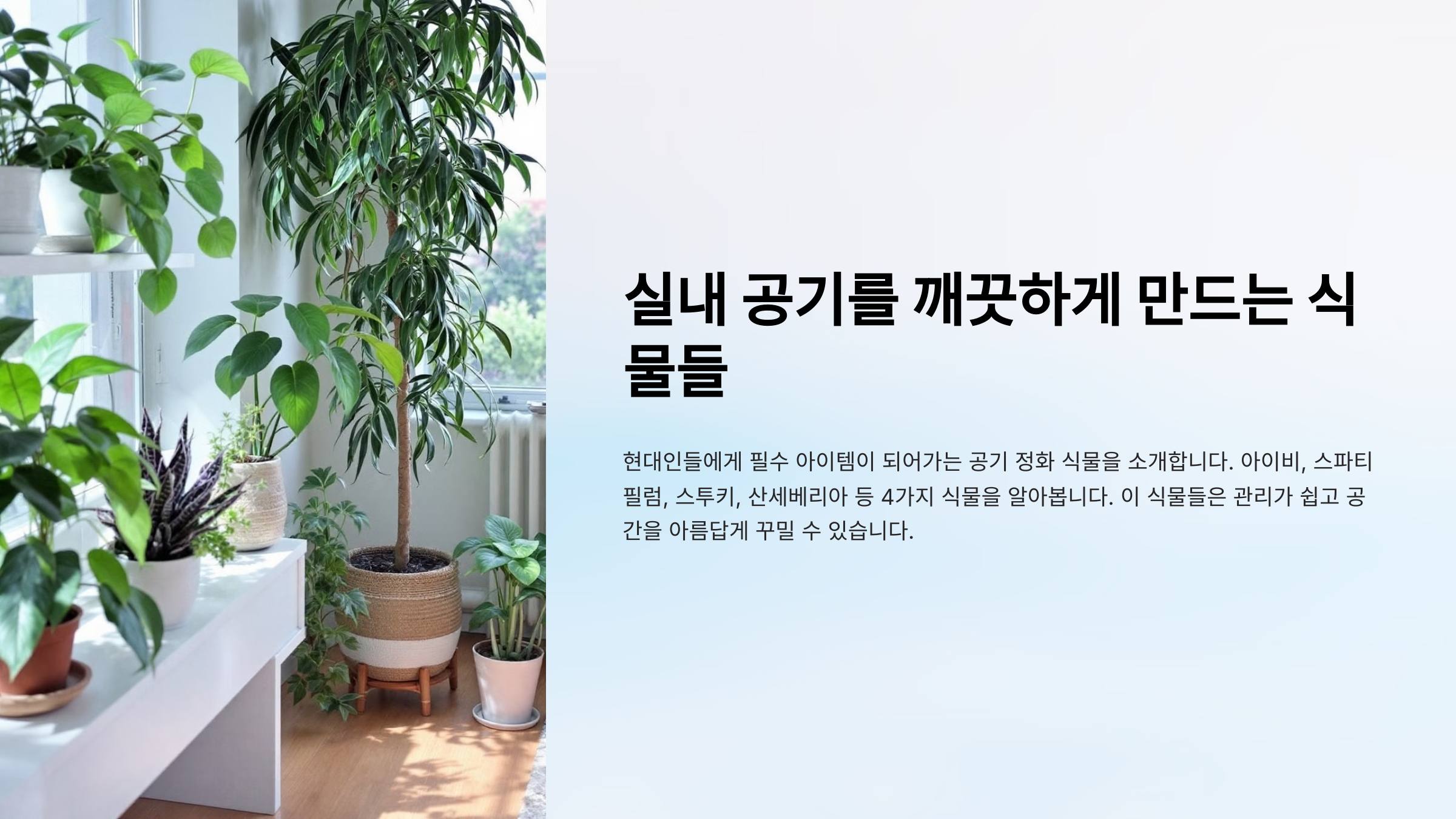 실내 공기를 깨끗하게 만들어주는 식물은 현대인들에게 필수 아이템이 되어가고 있습니다. 이번 글에서는 공기 정화에 탁월한 효과를 발휘하는 식물 4가지, 즉 아이비, 스파티필럼, 스투키, 산세베리아를 소개합니다. 이 식물들은 관리가 쉽고 공간을 아름답게 꾸밀 수 있어 인기 있는 선택지입니다.