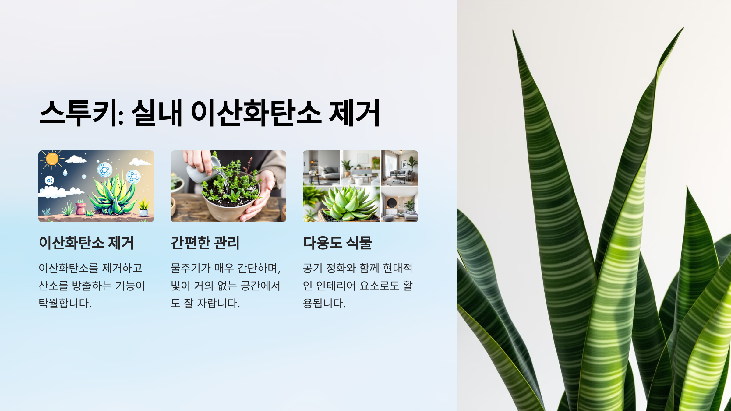 스투키는 이산화탄소 제거와 함께 산소를 방출하는 기능이 탁월하여 공기 정화 식물로 사랑받고 있습니다.